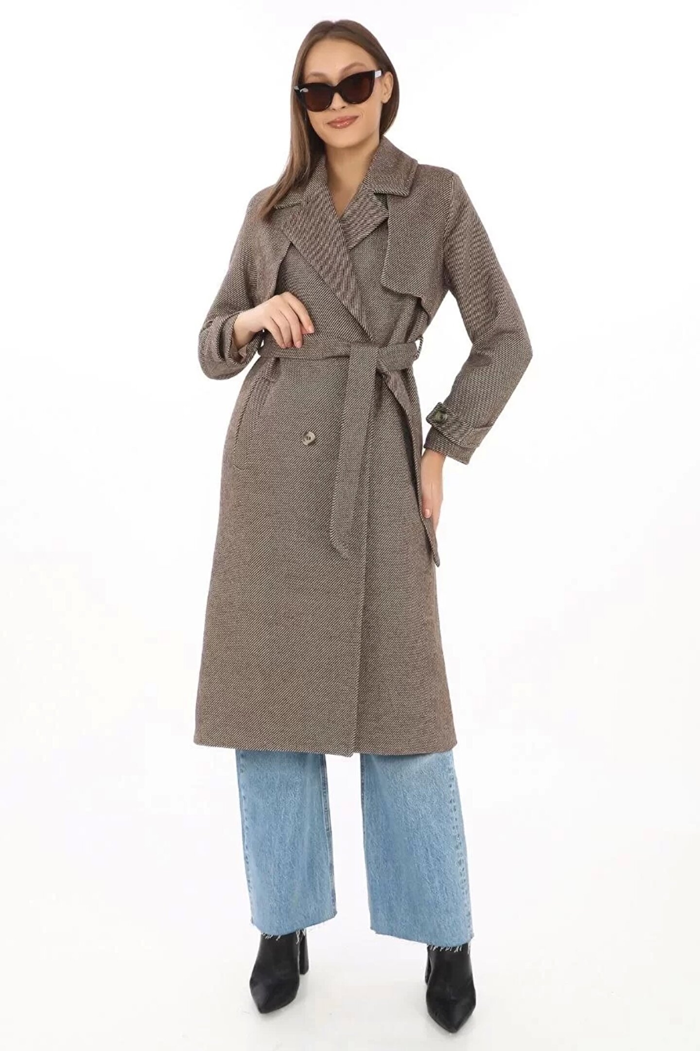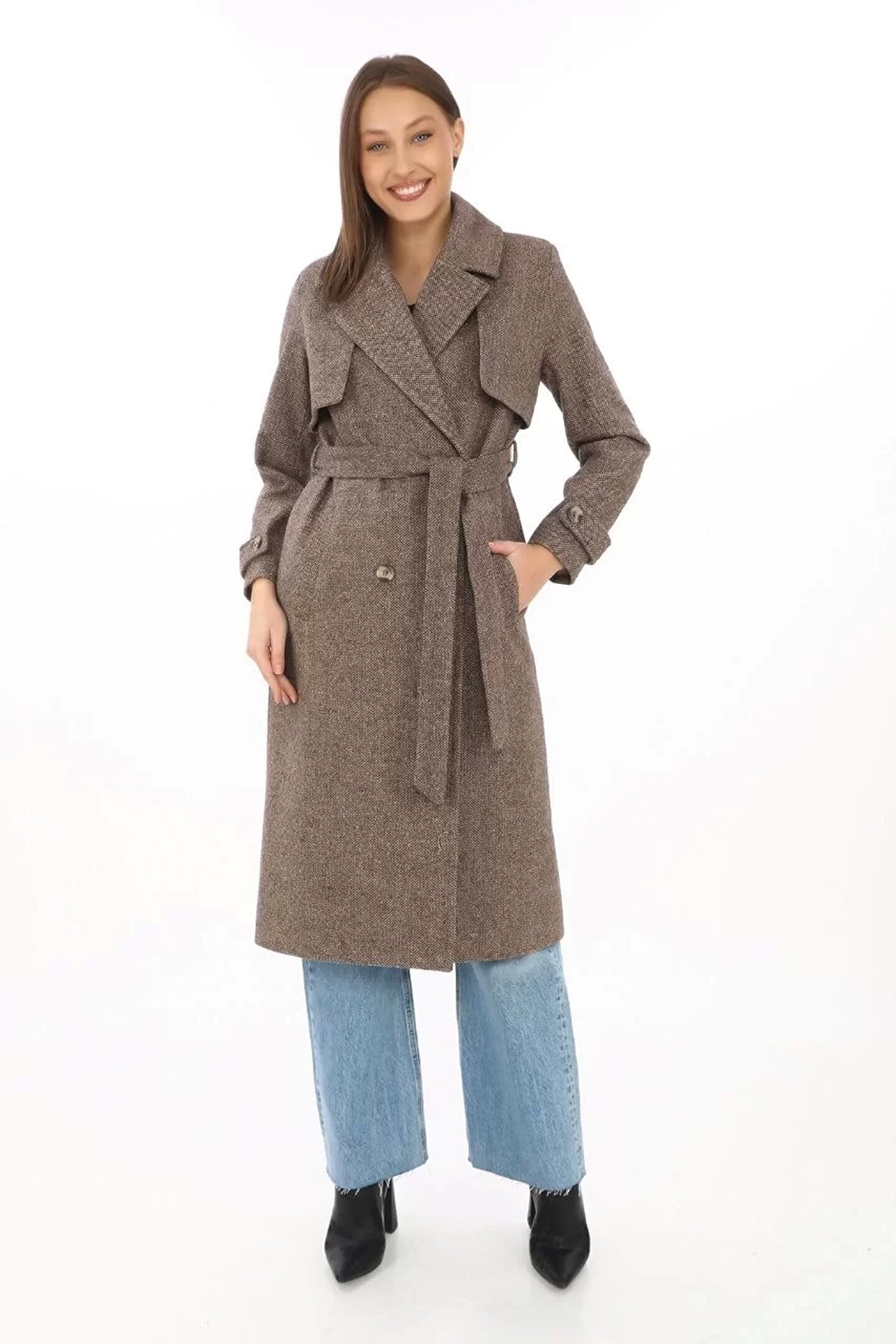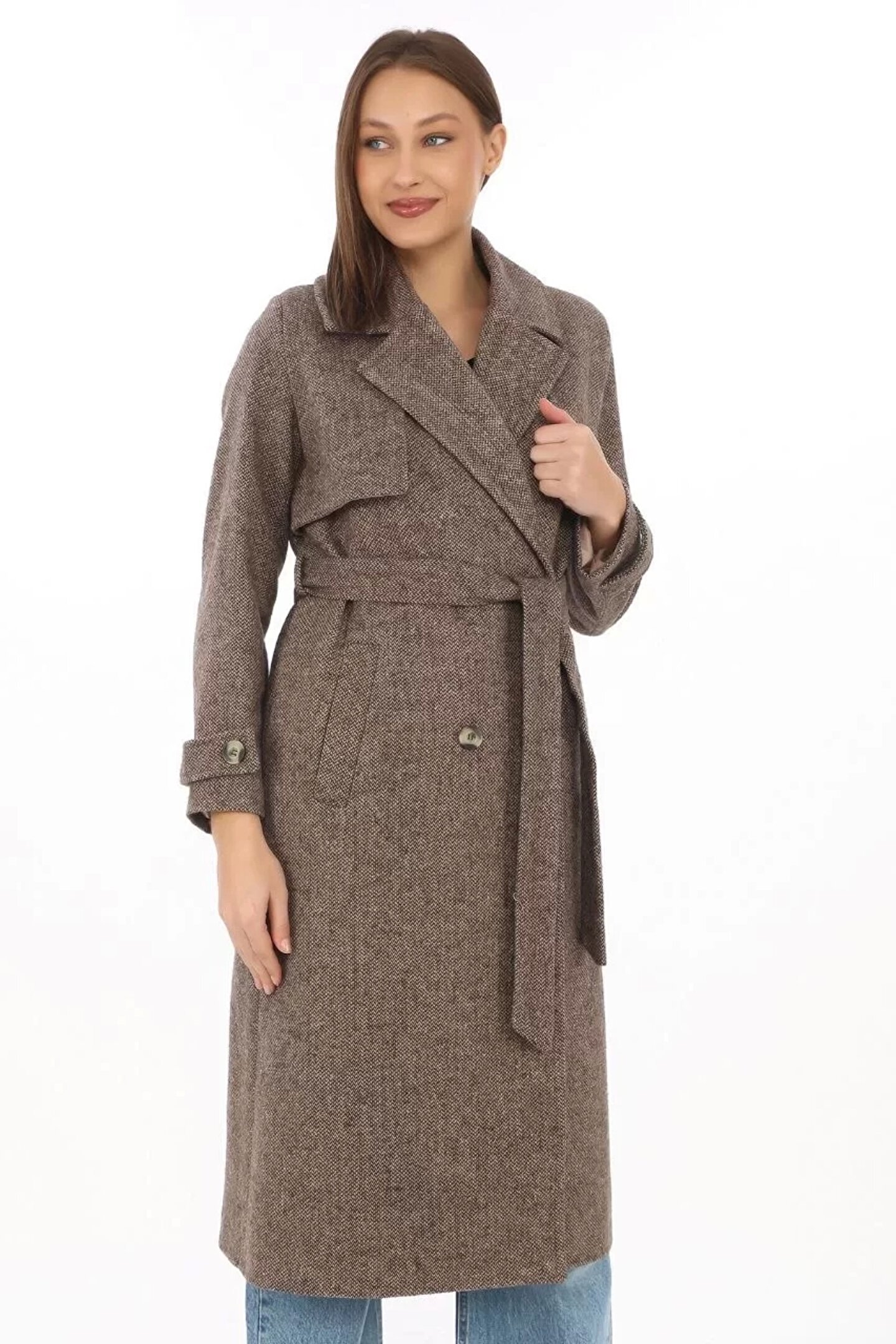 MODA Kadın Balık Sırtı Kaşmir Uzun Kaşe Kaban - Vizon