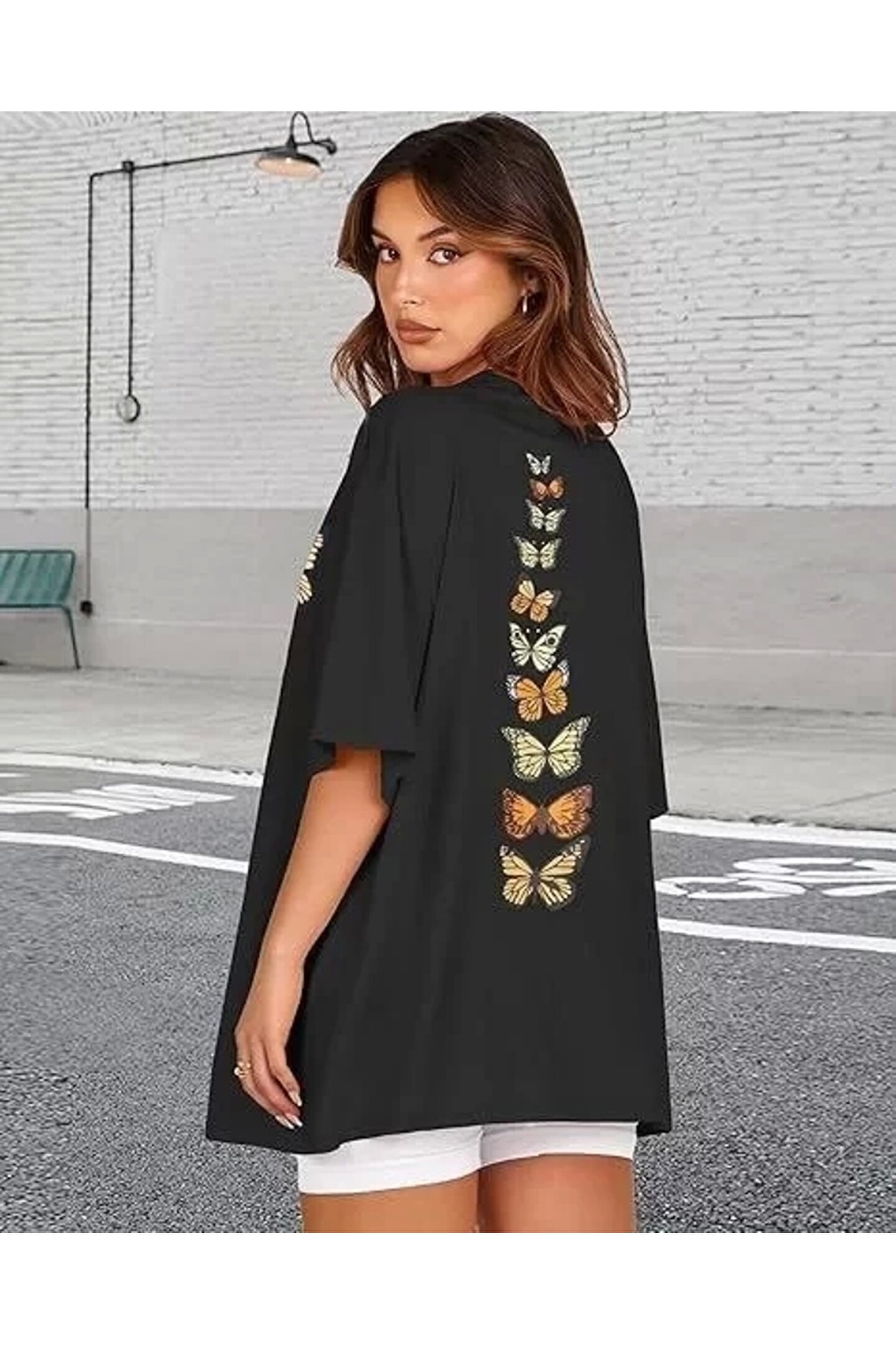 MODA Kadın Bisiklet Yaka Baskılı T-shirt - Siyah