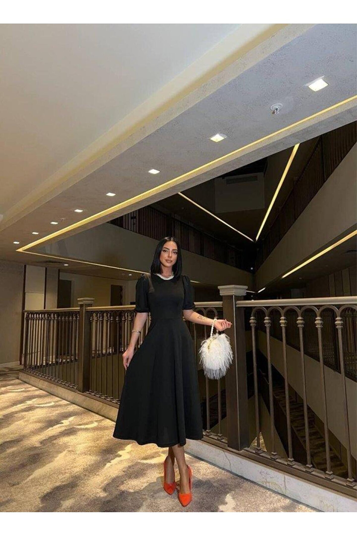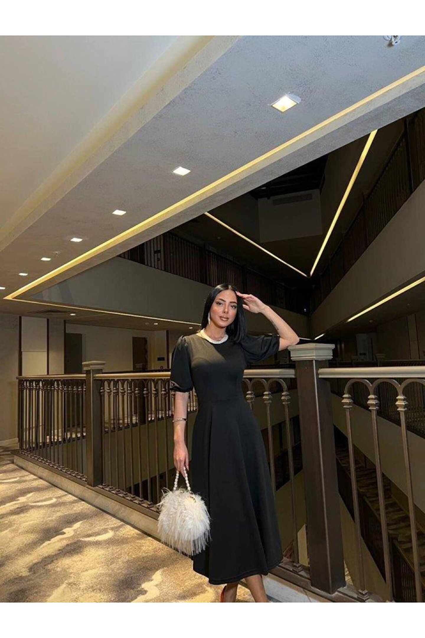 MODA Kadın Bisiklet Yaka Kısa Kol Lastik Detay Uzun Elbise