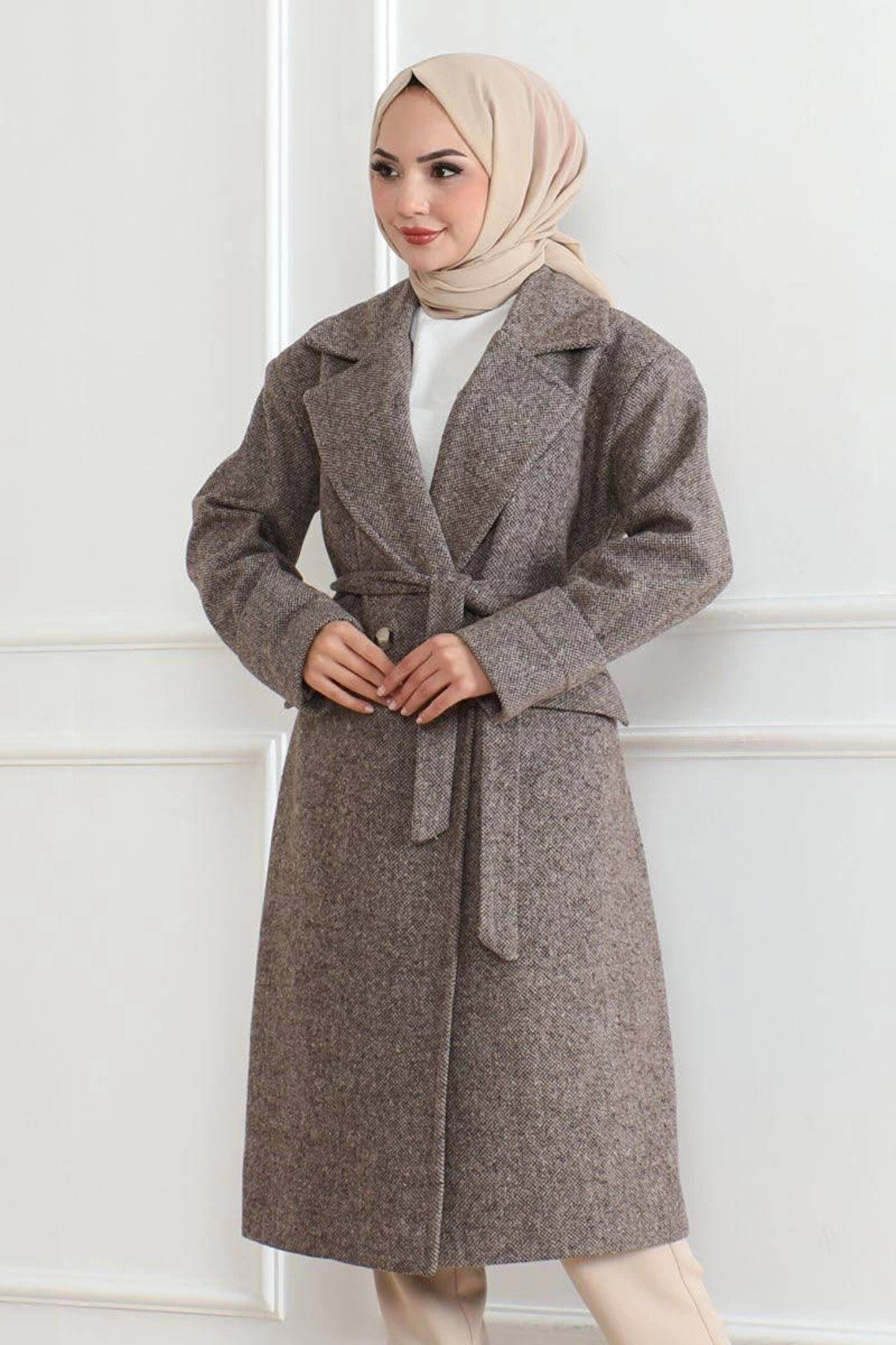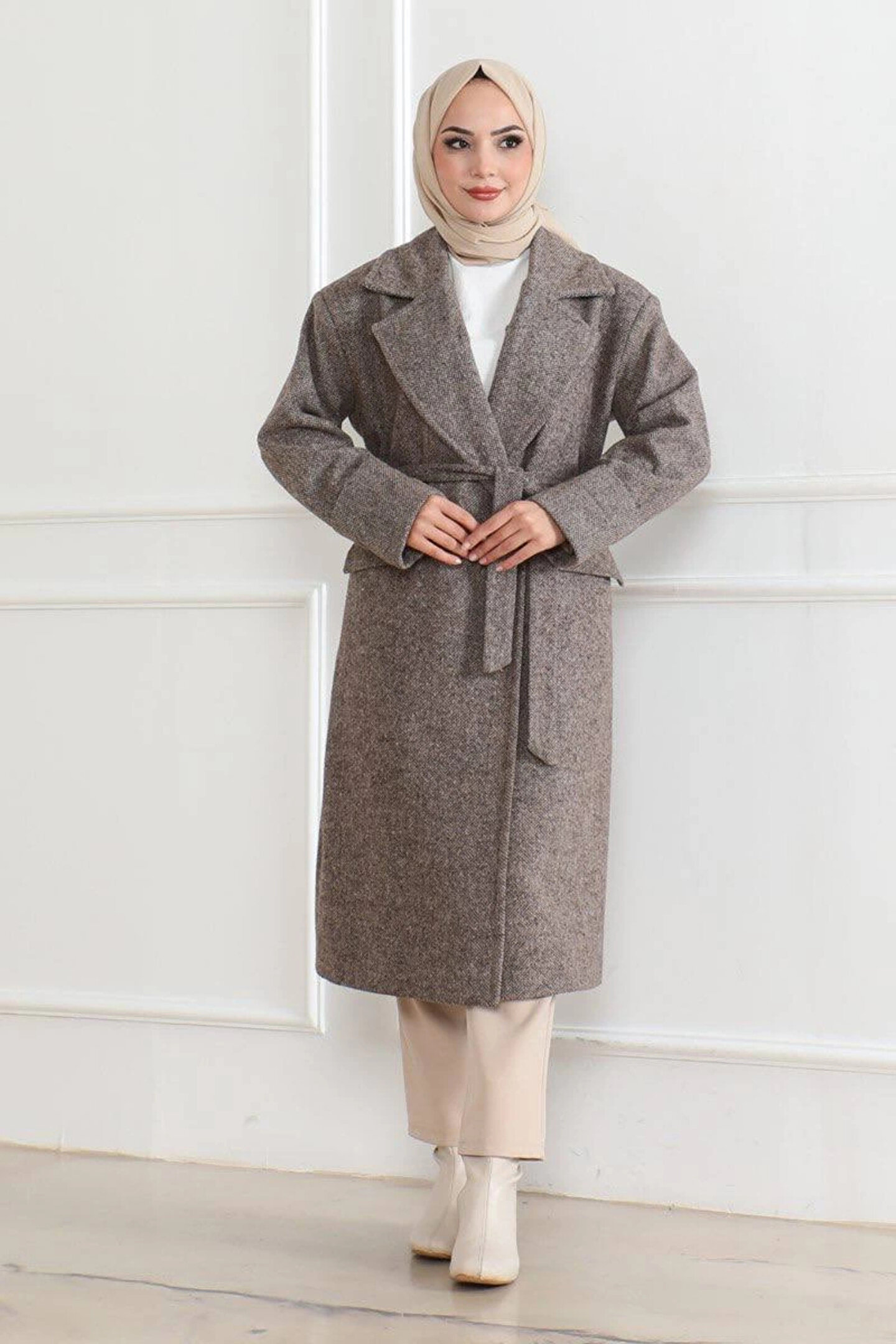 MODA Kadın Kaşe Kaban – Uzun Boy Kruvaze Yaka Kuşaklı Tesettür Kaşe Kışlık Kaban, Astarlı Şık Yünlü Dokum