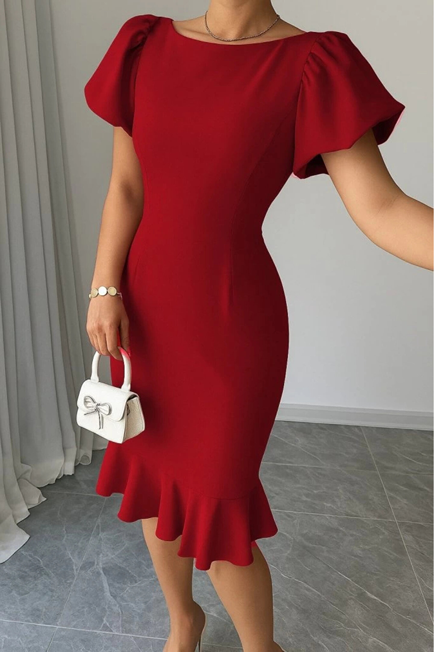 Kadın Kısa Kollu Yuvarlak Yaka Pileli Janjan Krep Elbise