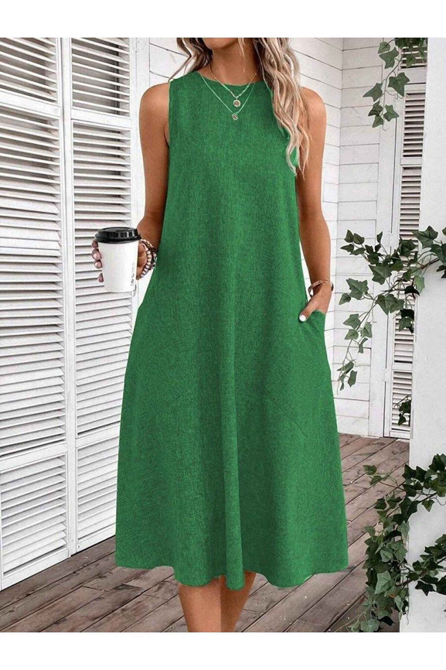 Kadın Kolsuz Bisiklet Yaka Cepli Midi Keten Elbise