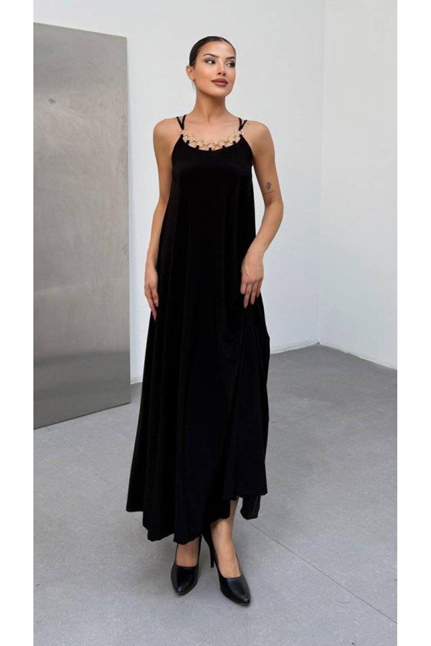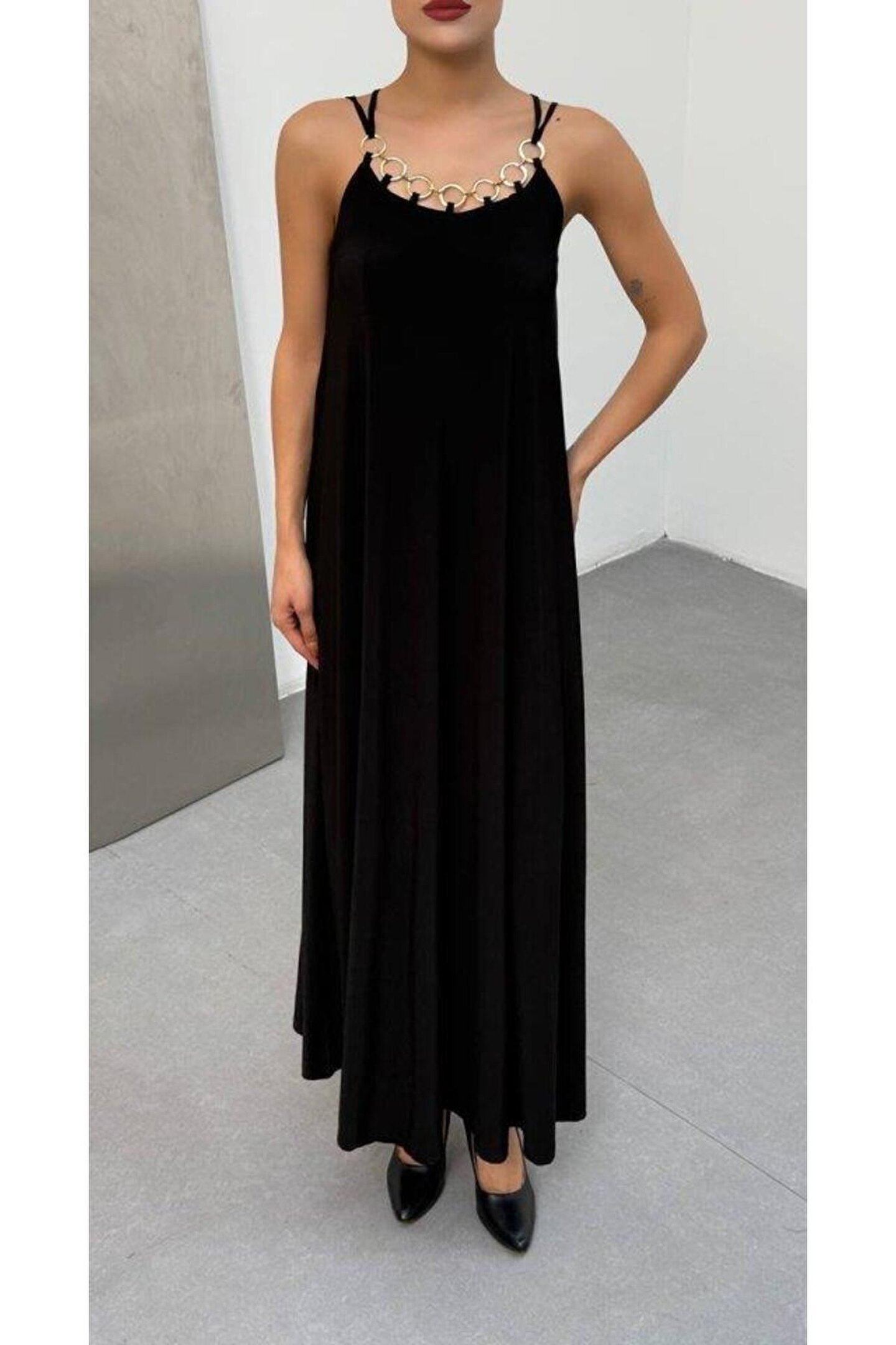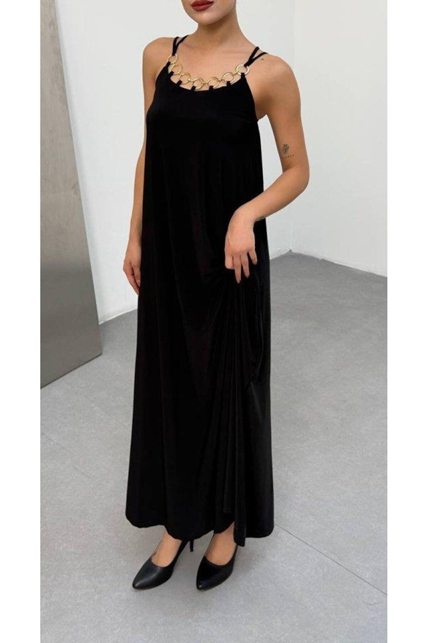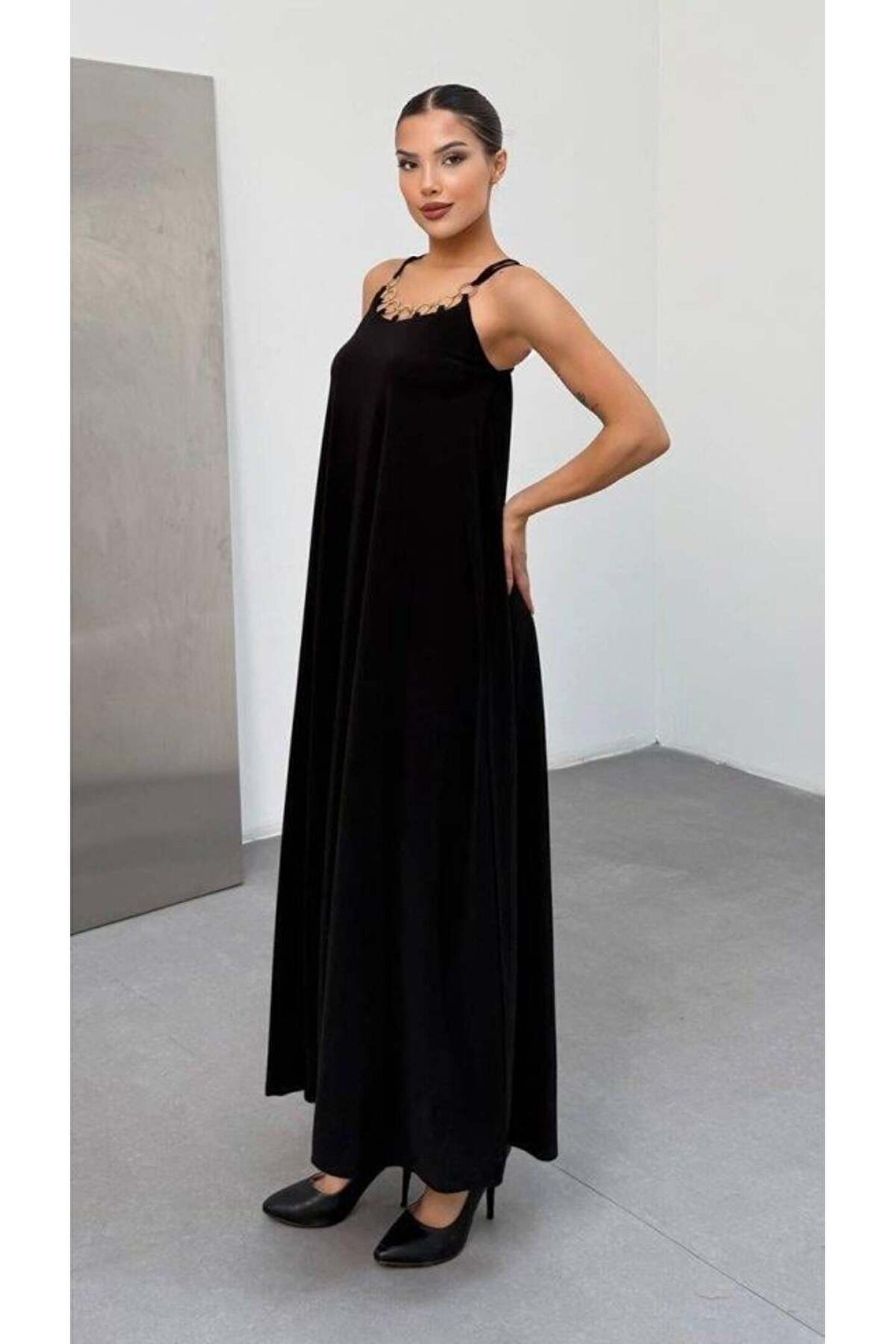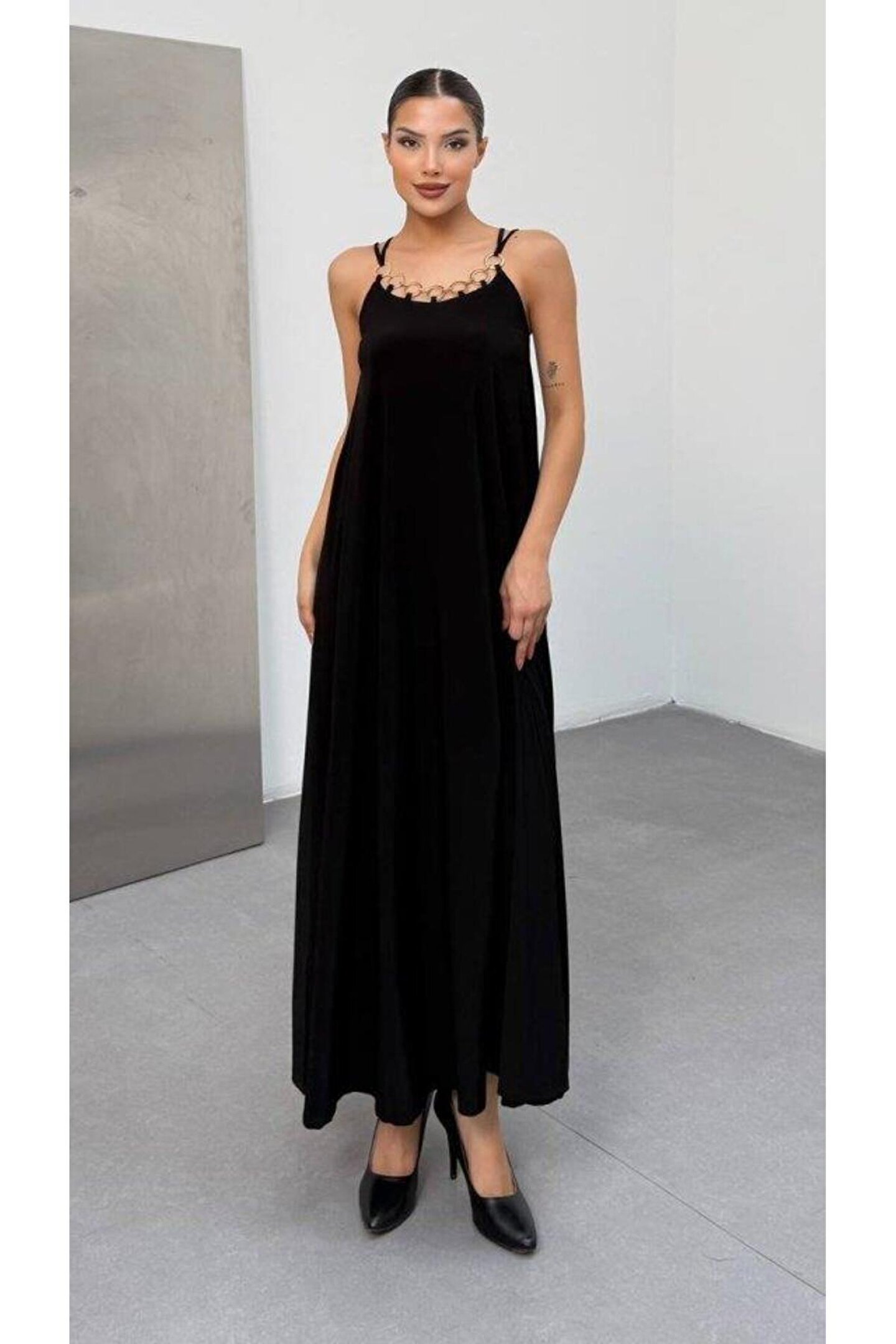 MODA Kadın Omuz Askılı Kuş Gözü Zincir Detay Sandy Kumaş Maxi Boy Elbise