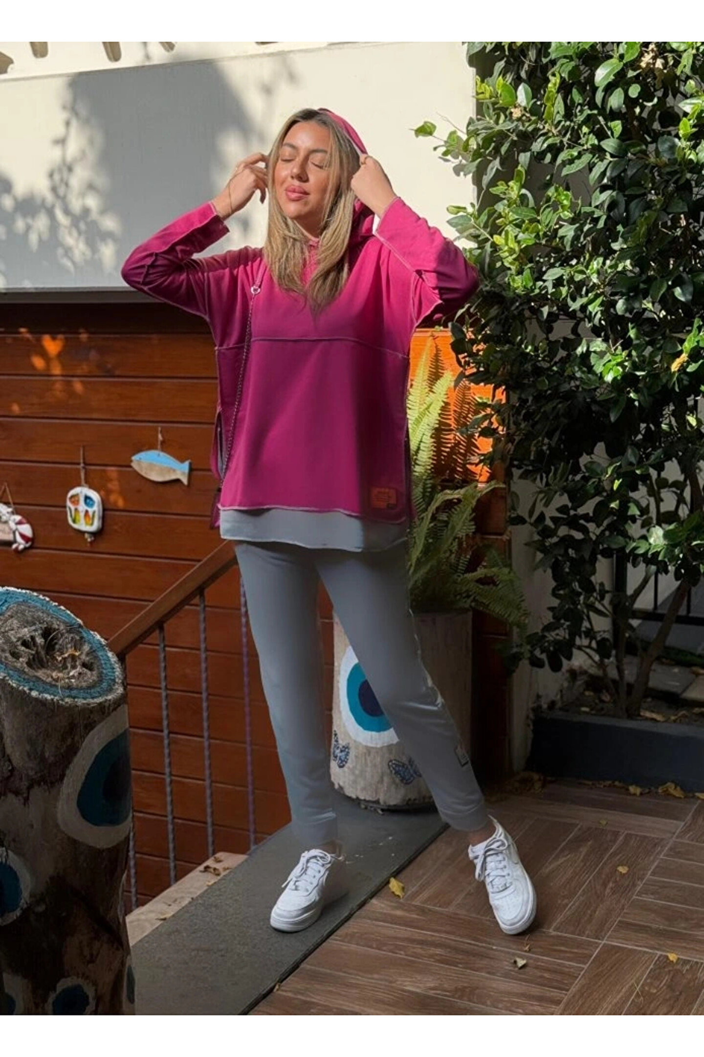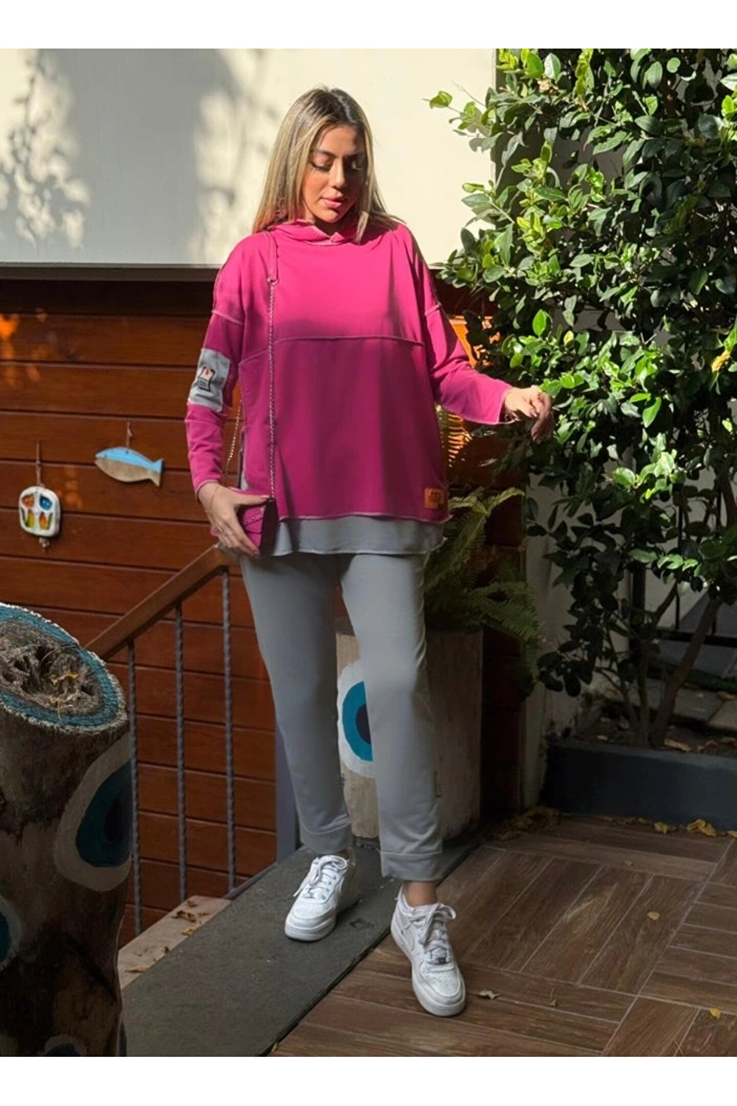 Kadın Pembe Kapşonlu Etek Ucu Detay Arma Ters Dikiş Gorunumlu Ikili Takım