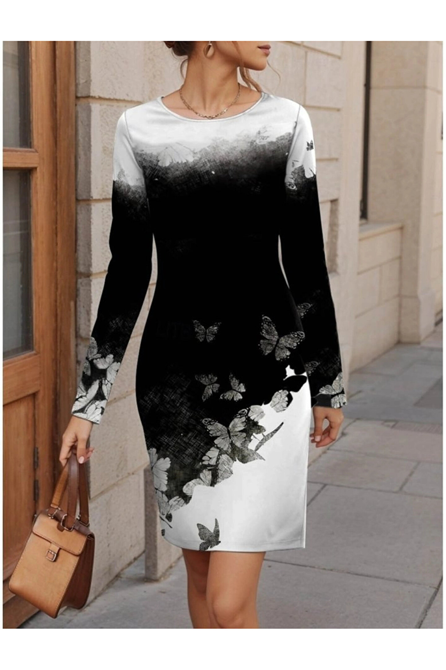 Kadın Uzun Kollu Bisiklet Yaka çiçek Desenli Kısa şardonlu Dalgıç Elbise
