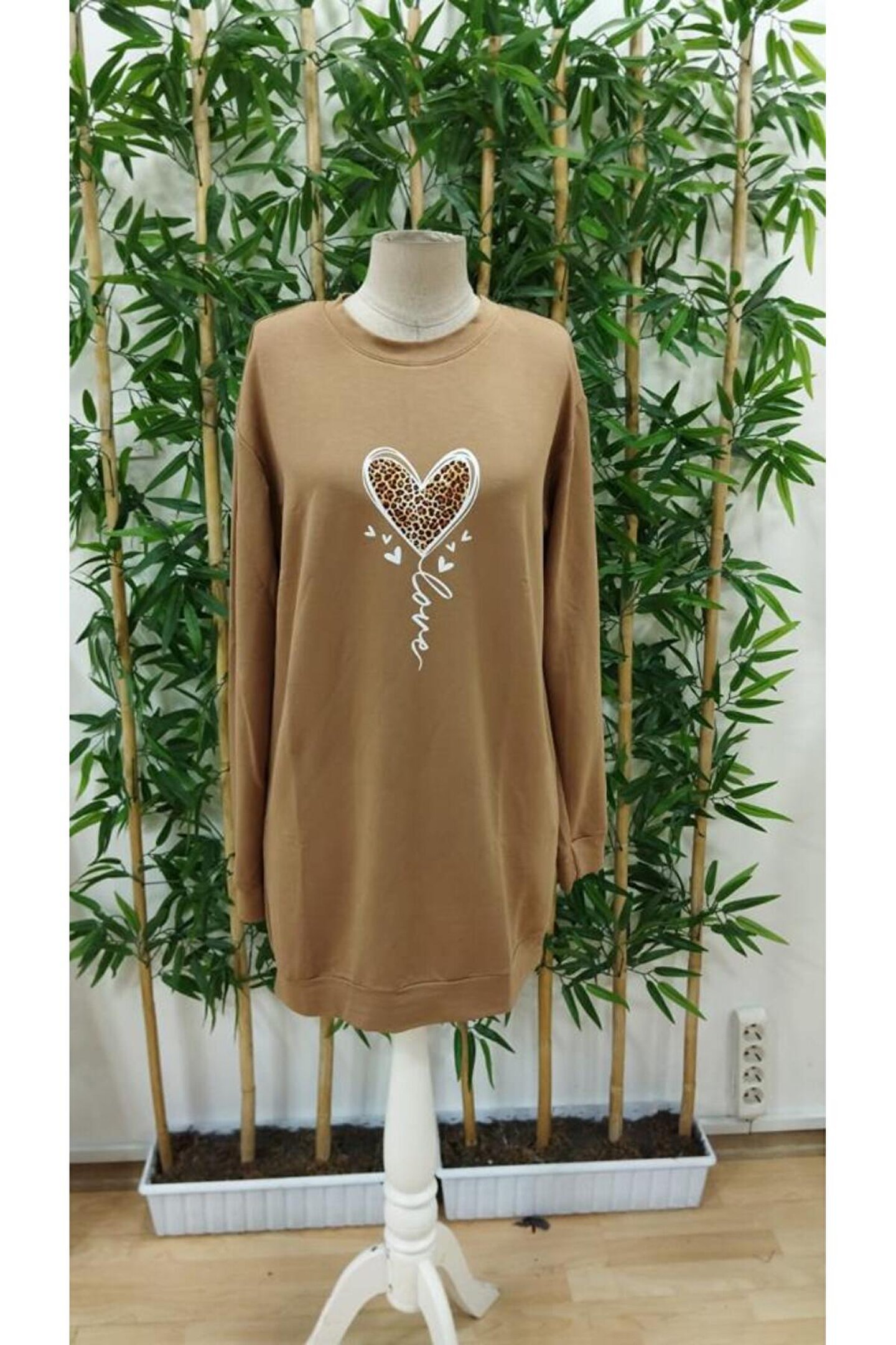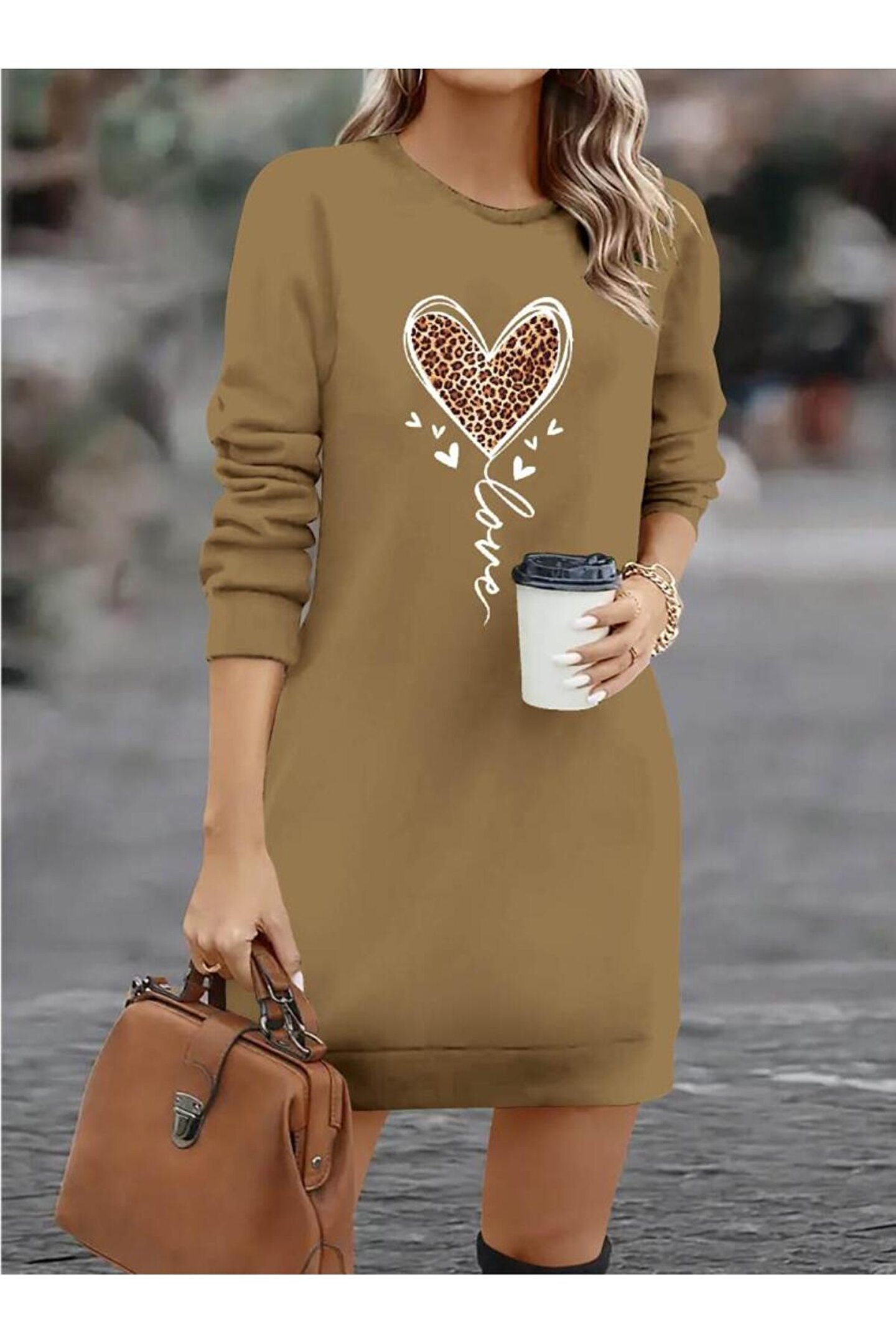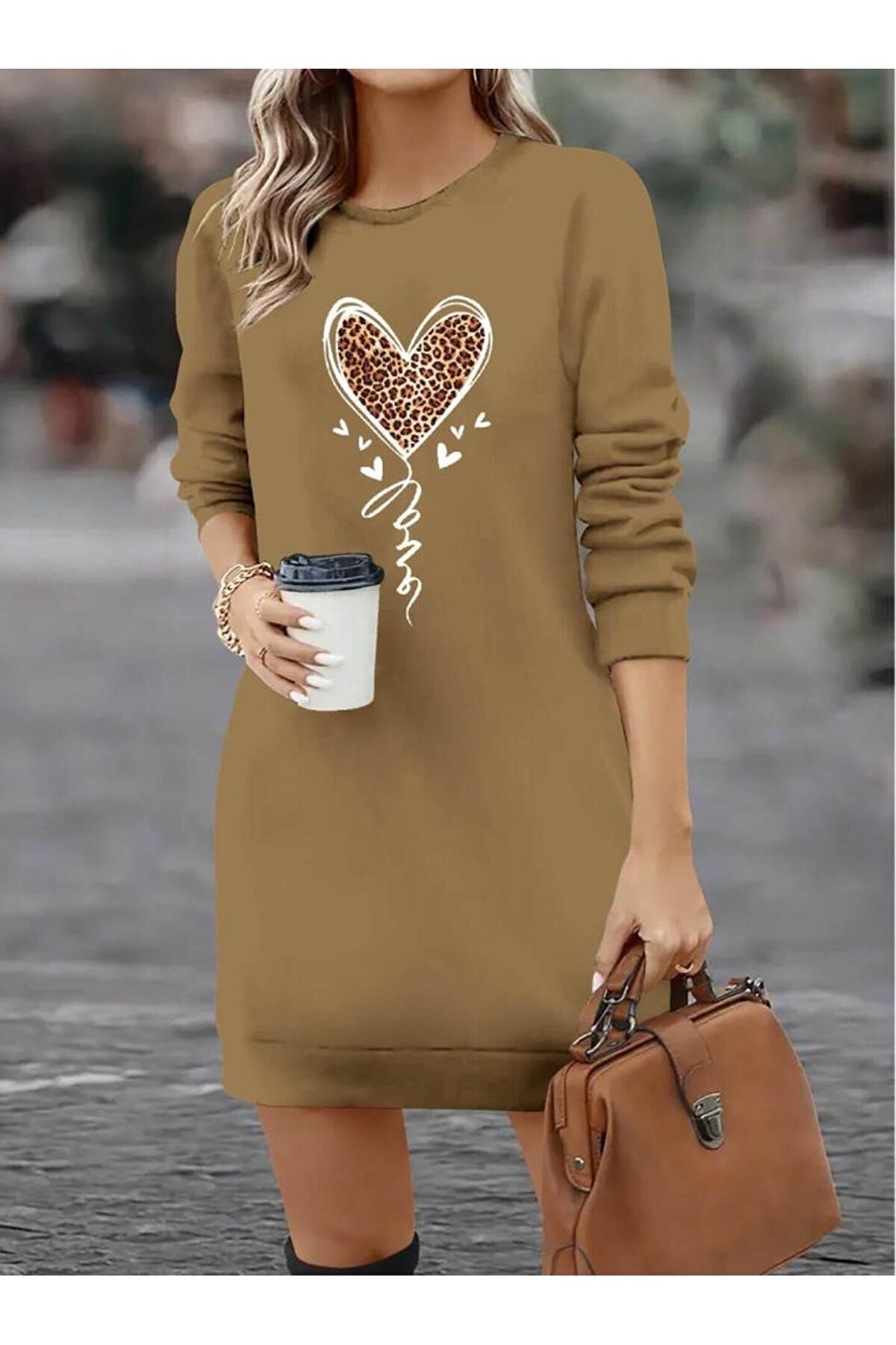 Kadın Uzun Kollu Bisiklet Yaka Kalp Desenli Kısa Viskon Elbise