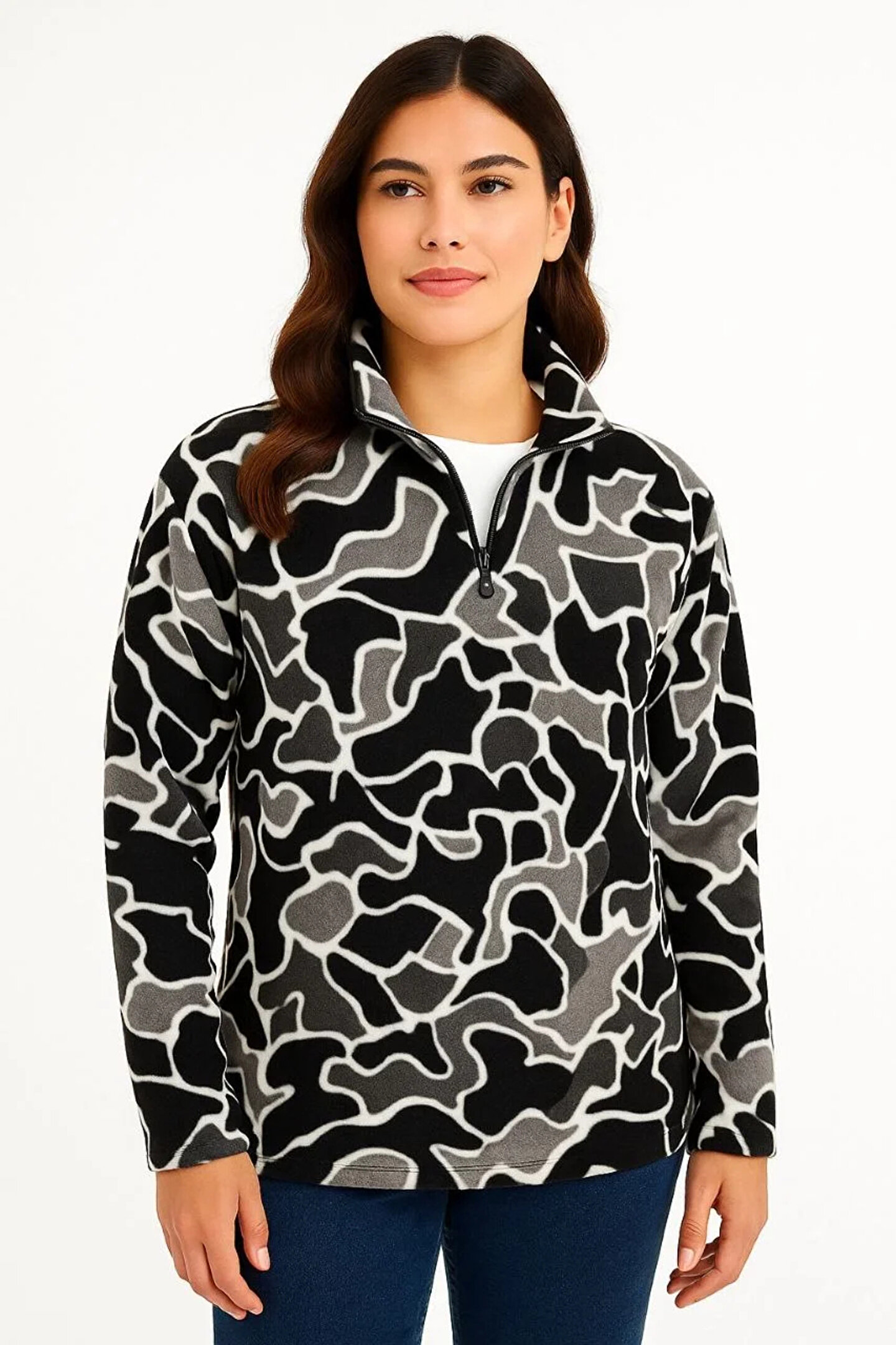 MODA KADIN Yarım Fermuarlı Desenli Polar Sweat Yakalı, Uzun Kollu, Oversize Rahat Kalıp - Siyah