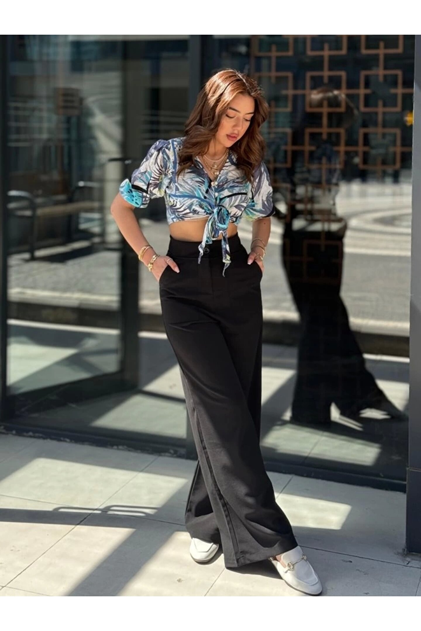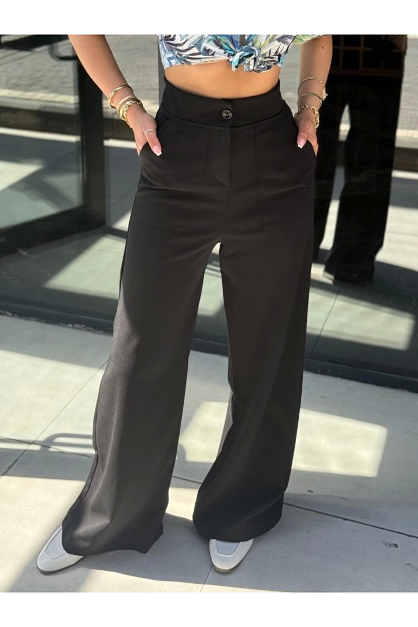 Kadın Yüksek Bel Geniş Paça Detaylı Cepli Ithal Krep Pantolon