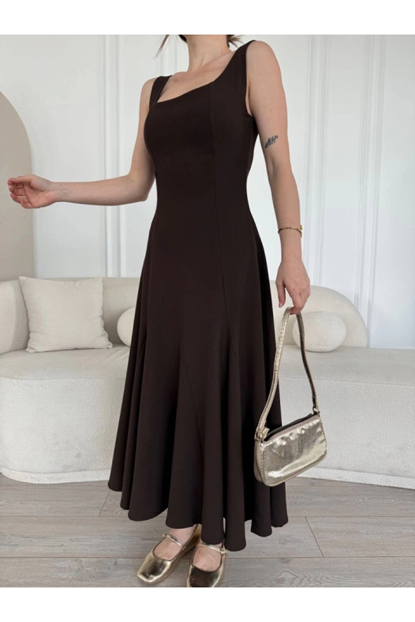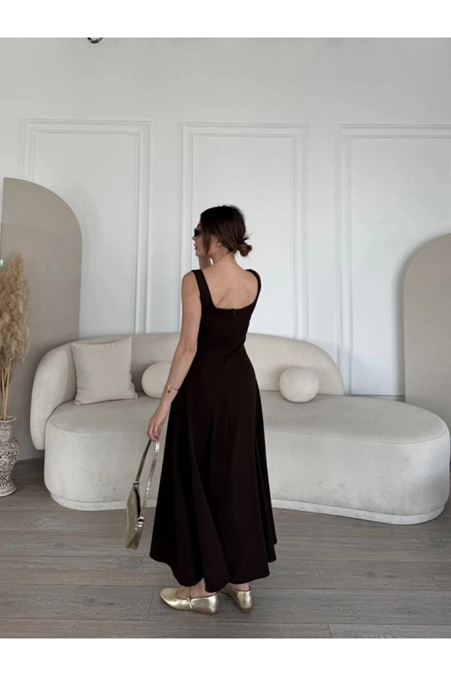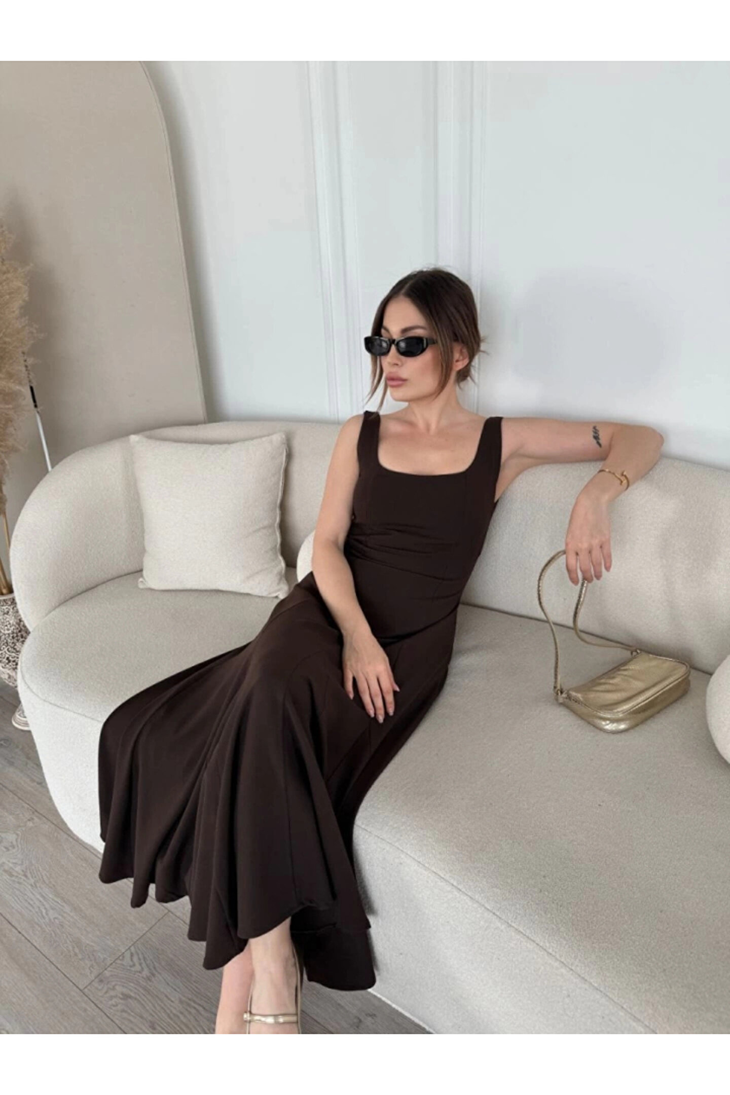 Moda Kayacan MDB ırt Dekolteli Kolsuz Uzun Elbise Kahverengi