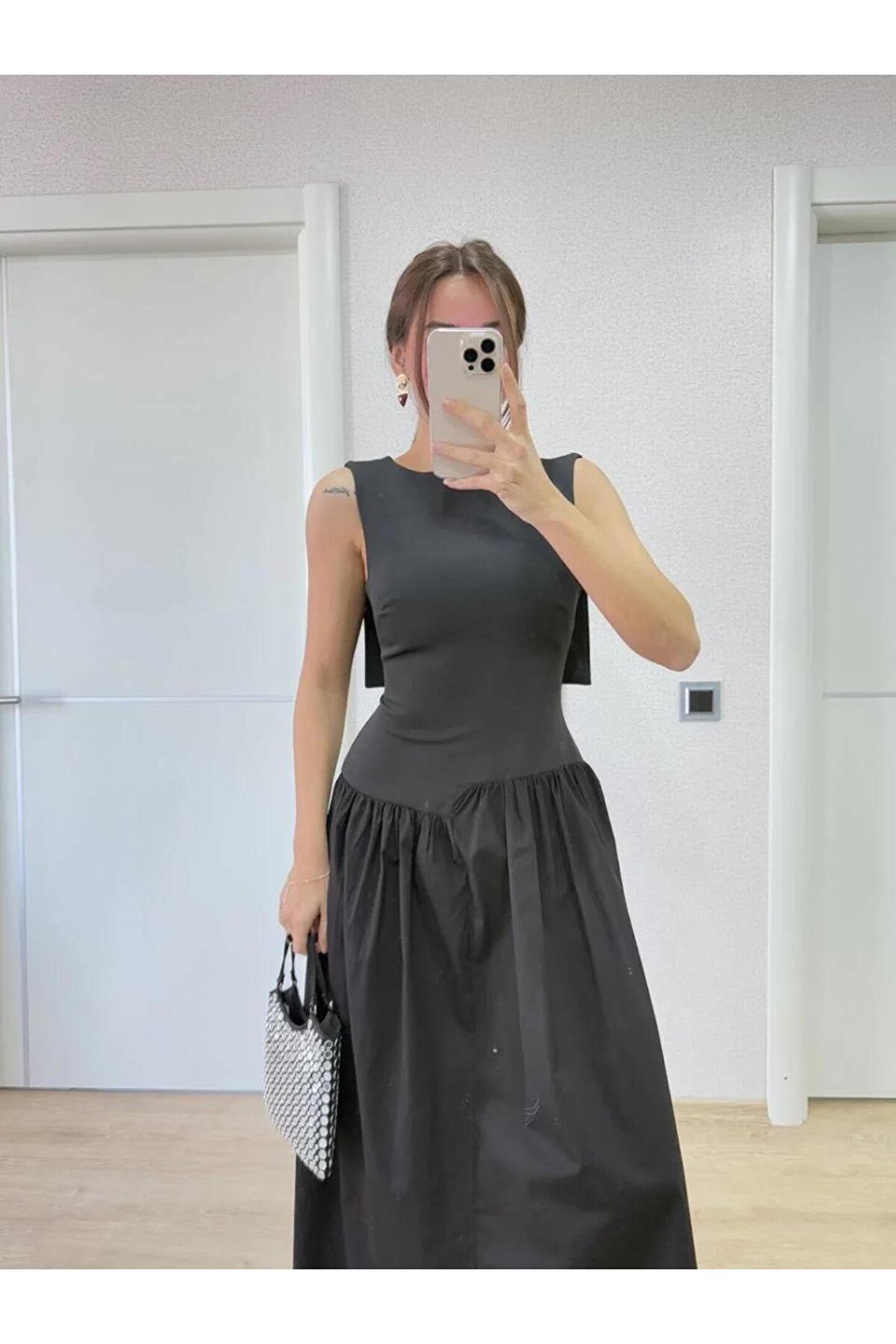 Krep Arkası Kanat Arka Ön Pens Detaylı Uzun Kadın Elbise - Siyah