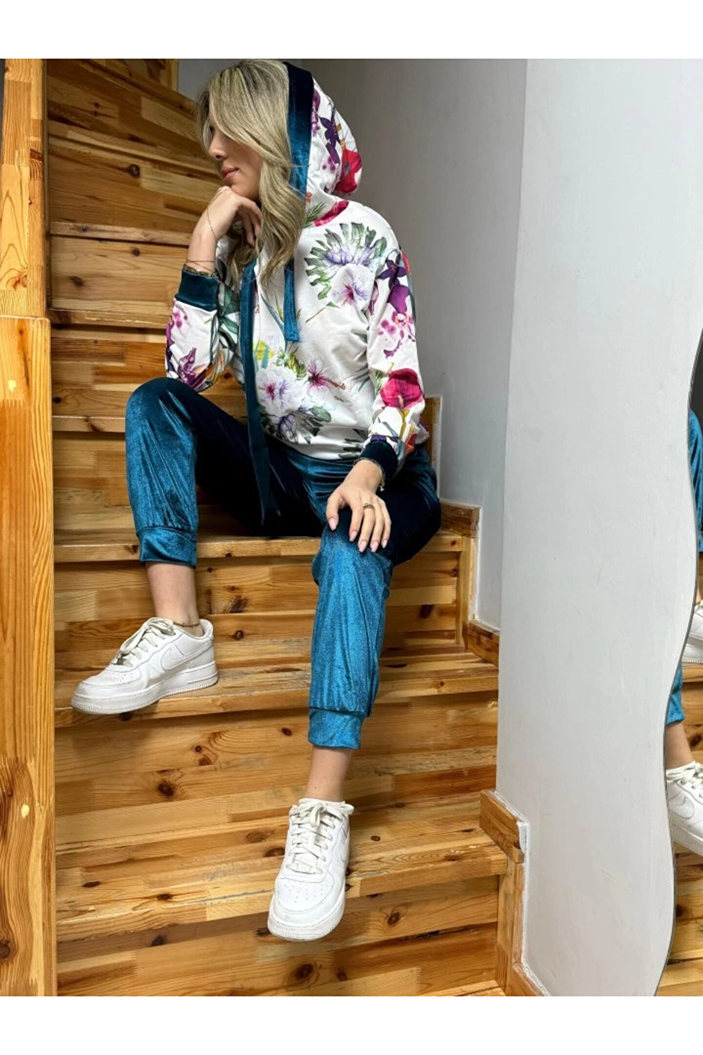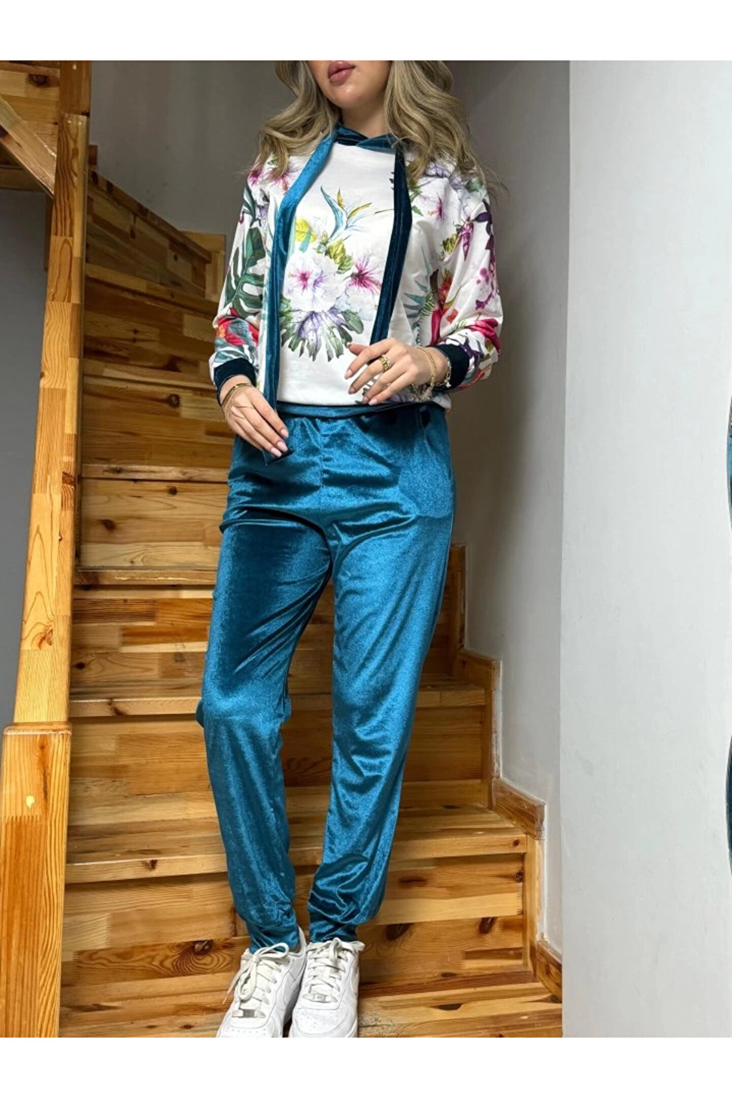 MODA MDB Kadın Kadife Kumaş Uzun Kollu Kapüşon Detay çiçek Baskılı Sweat Ve Pantolon Ikili Takım