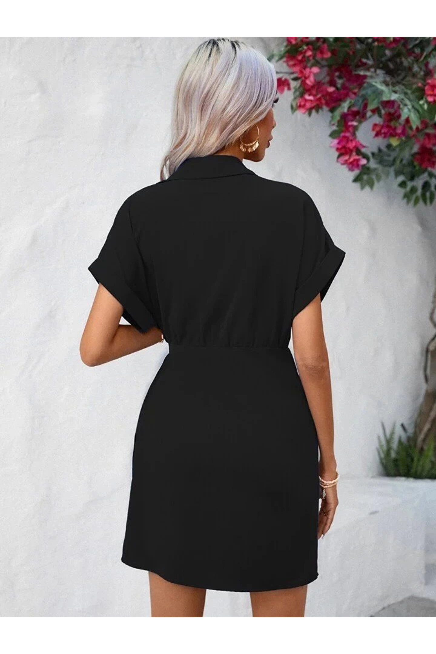 Kadın Kısa Kollu Yakalı Yandan Bağlamalı Dokuma Elbise