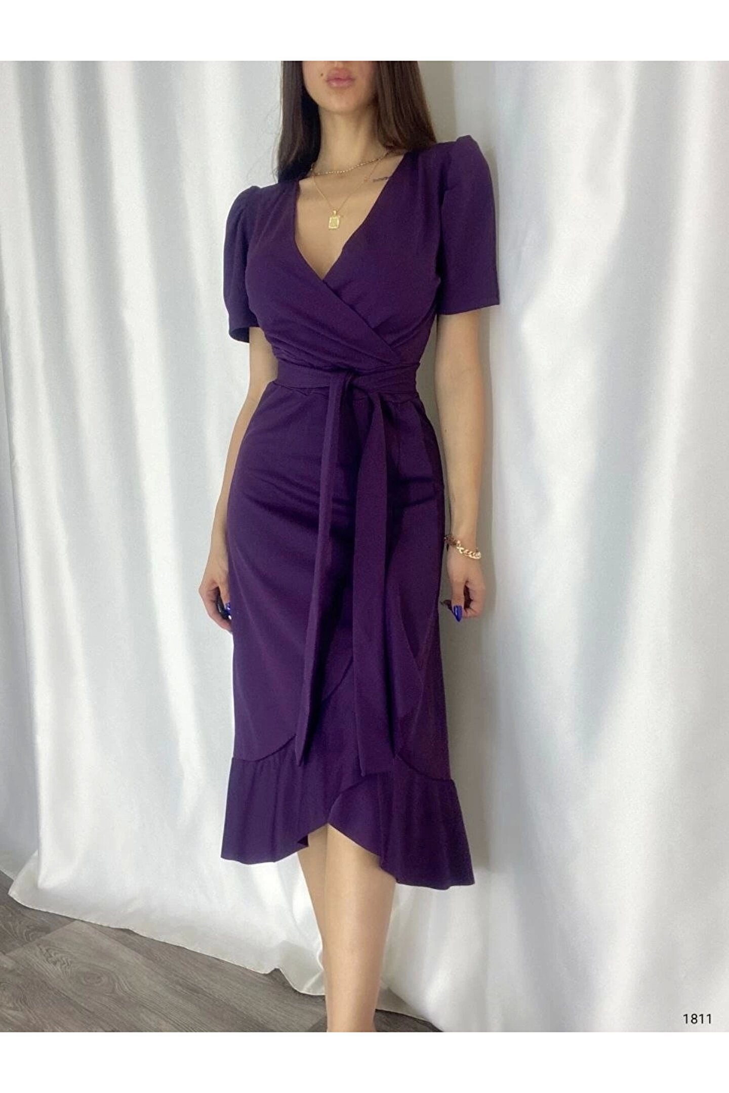 MODA MDB Kadın Kruvaze Yaka idi Boy Kuşaklı Krep Elbise 120 Cm