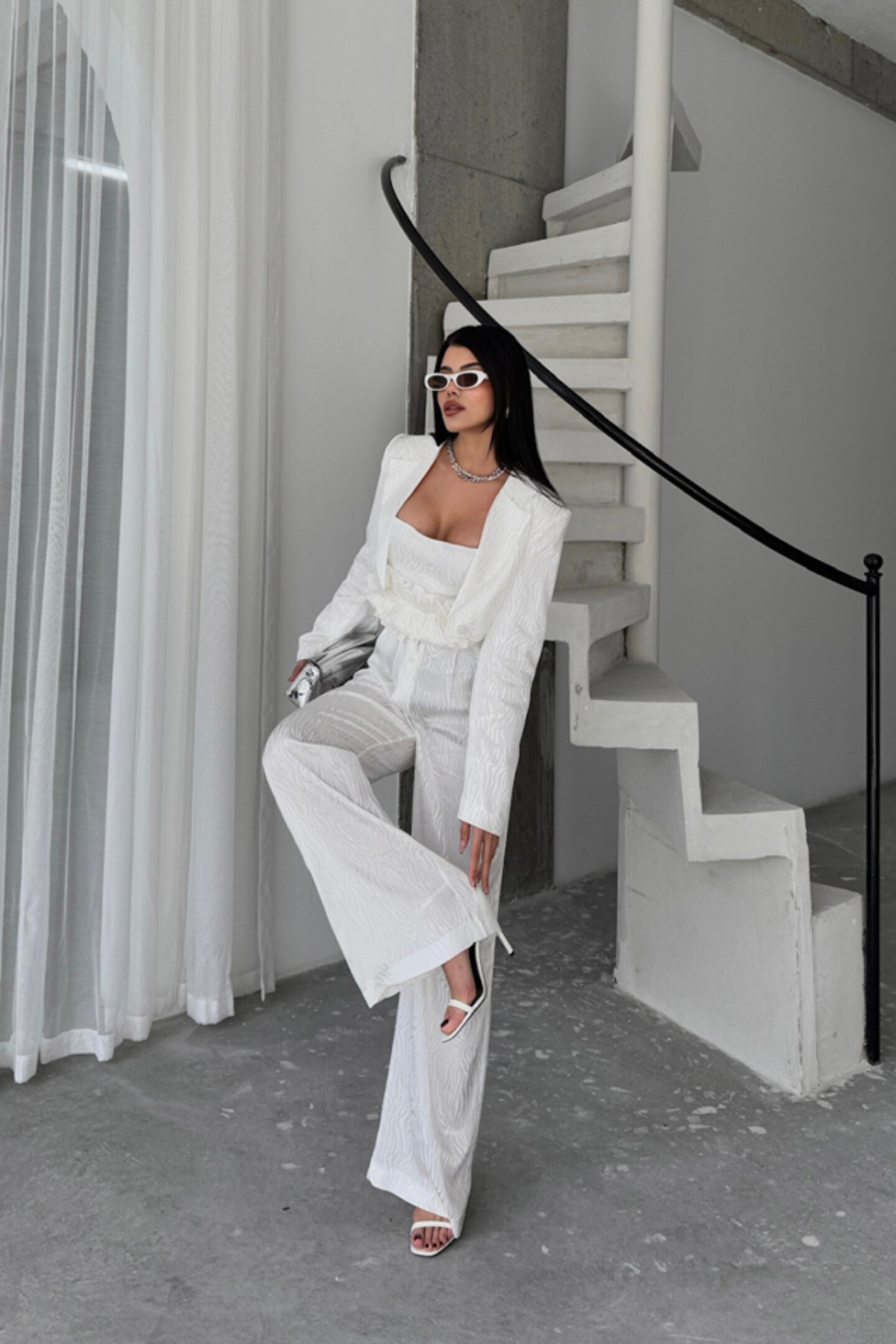 JAKARLI BLUZU TASARIM DETAYLI CEKET-PANTOLON-BLUZ 3 LÜ TAKIM - Beyaz