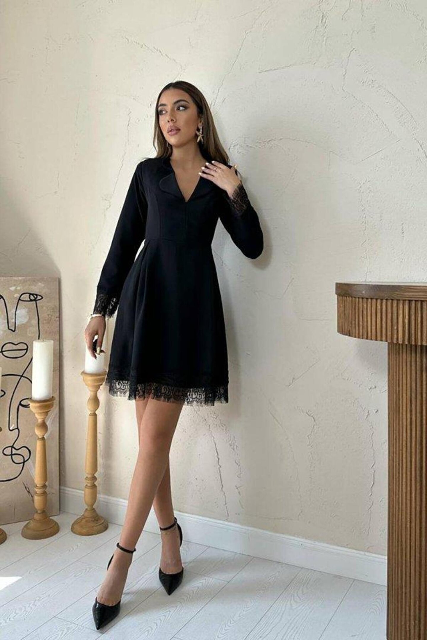 Siyah Dantel Detaylı Kruvaze Yaka Elbise