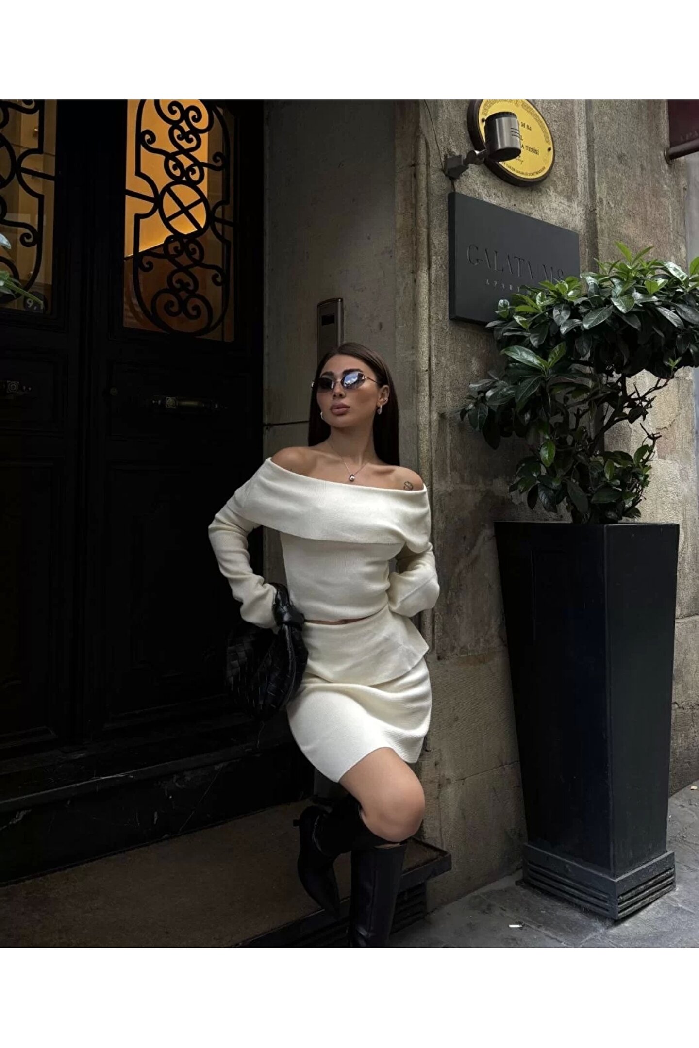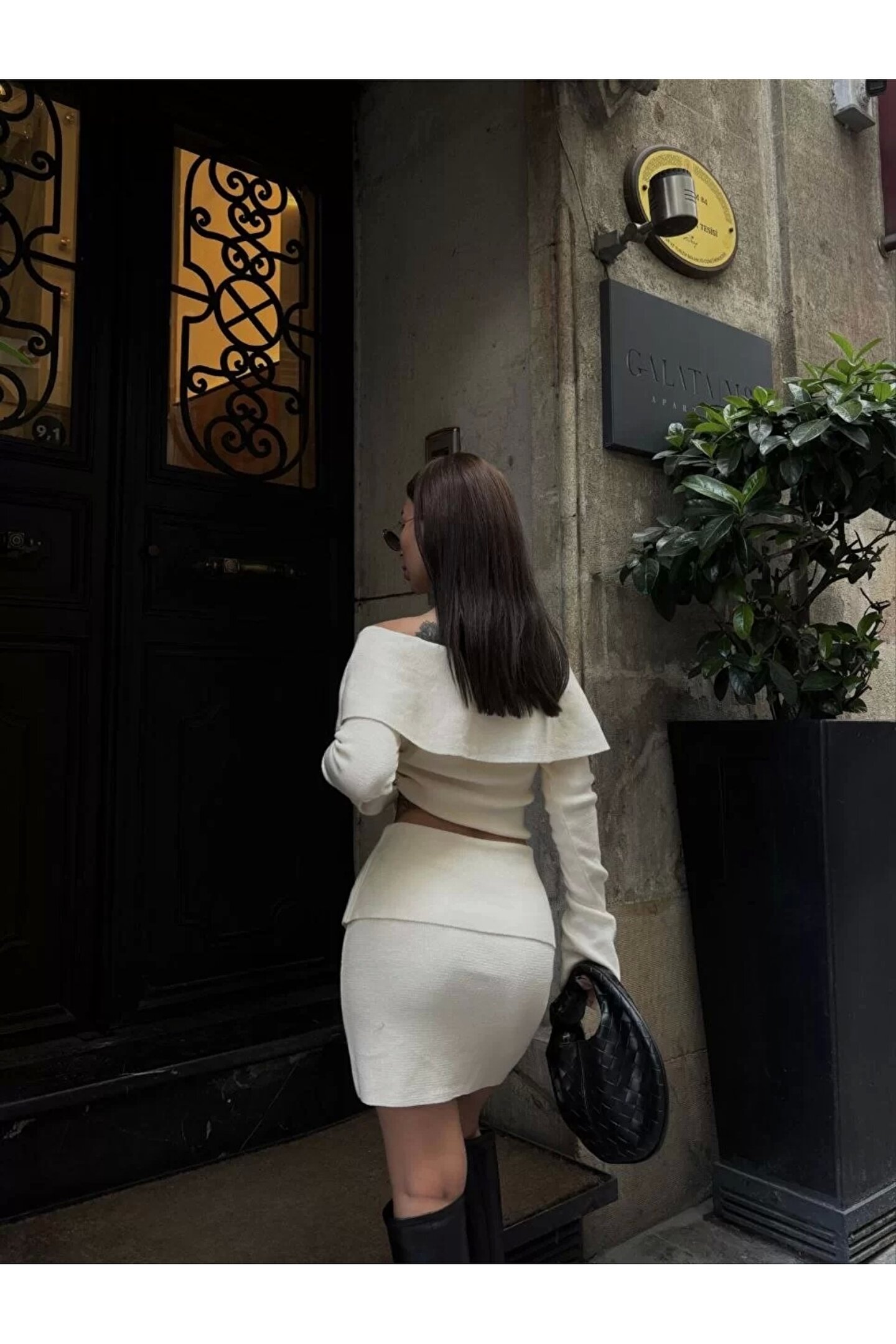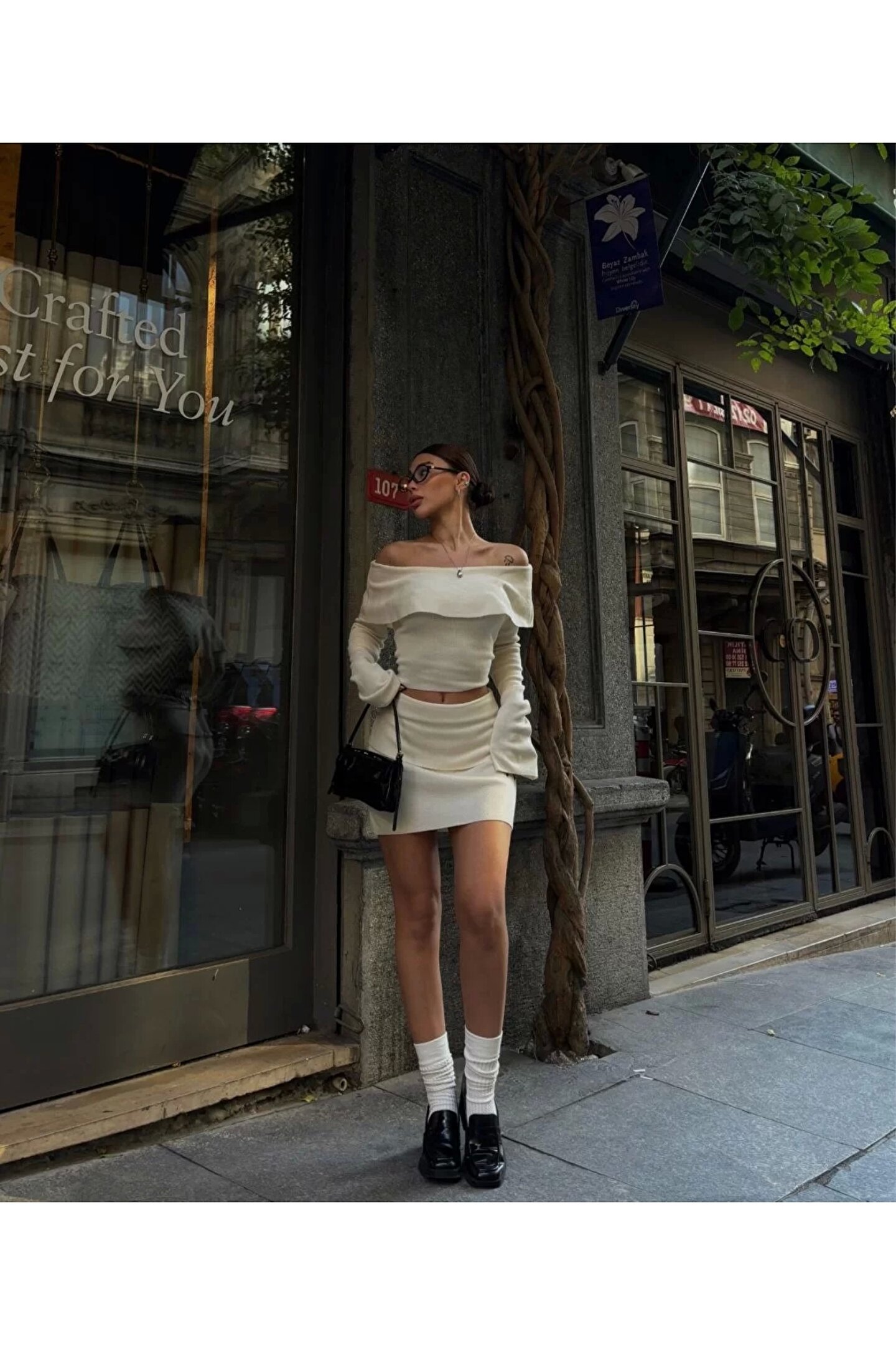 MODA Straplez , Madonna , Carmen Yaka Croplu Mini Etekli ikili Takım Triko - Beyaz