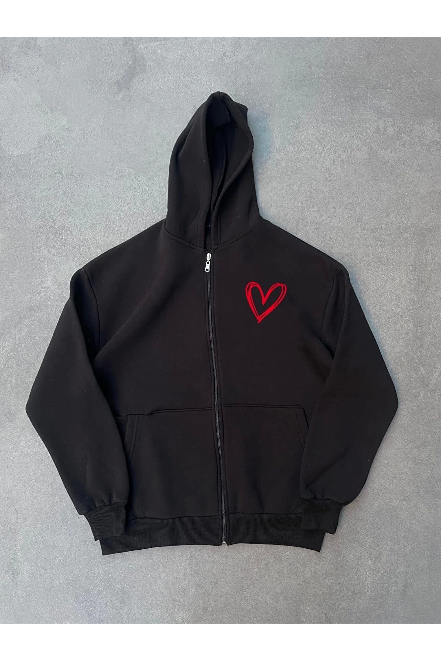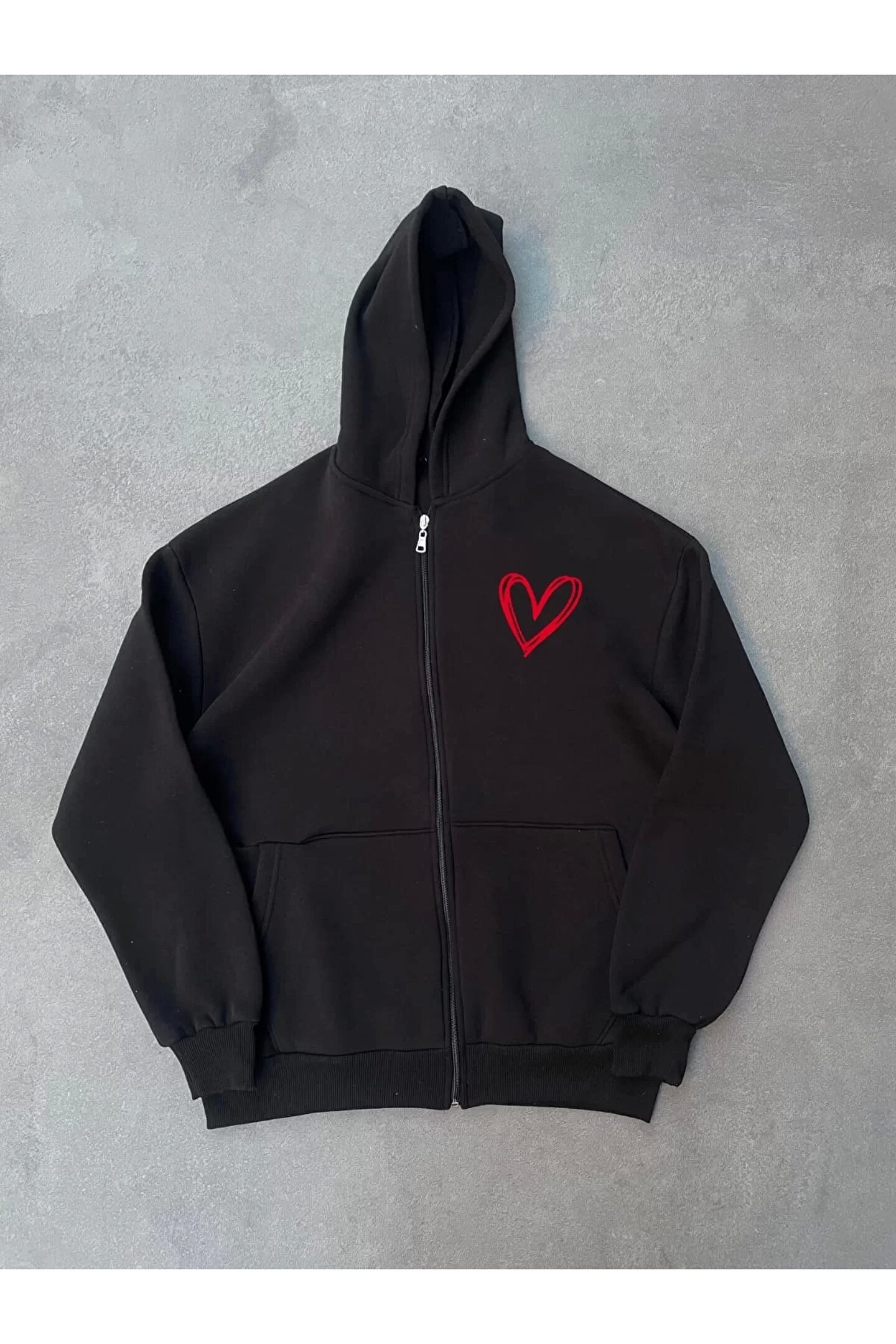 MODA Üç İplik Baskılı Fermuarlı Kapüşonlu Hırka - Siyah