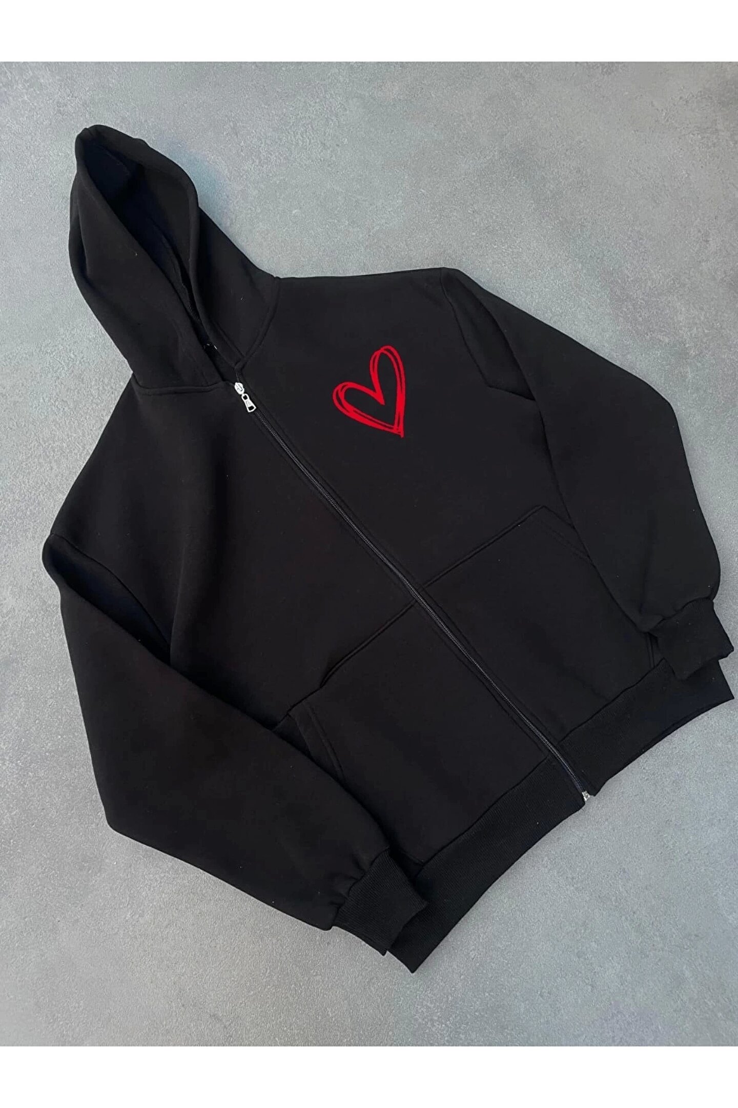 Üç İplik Baskılı Fermuarlı Kapüşonlu Hırka - Siyah