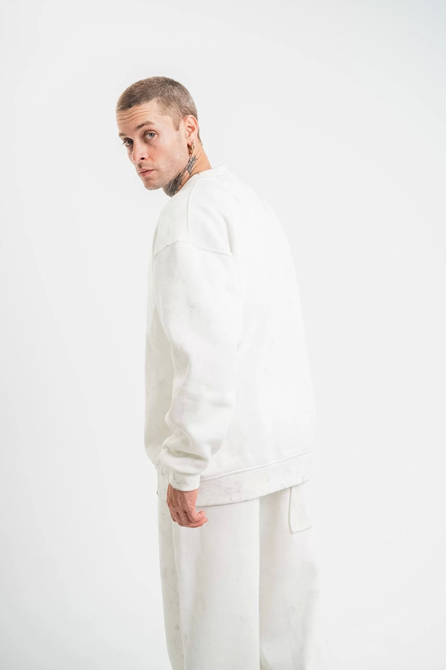 Unisex Uzun Kol Bisiklet Yaka Yıkamalı SweatShirt - Beyaz