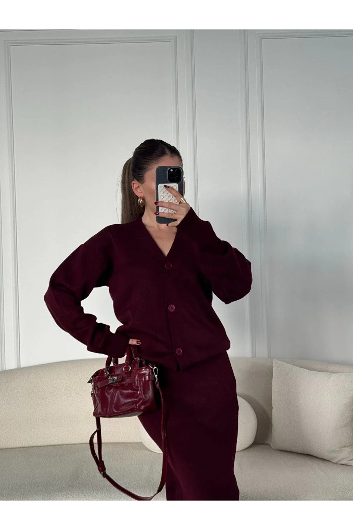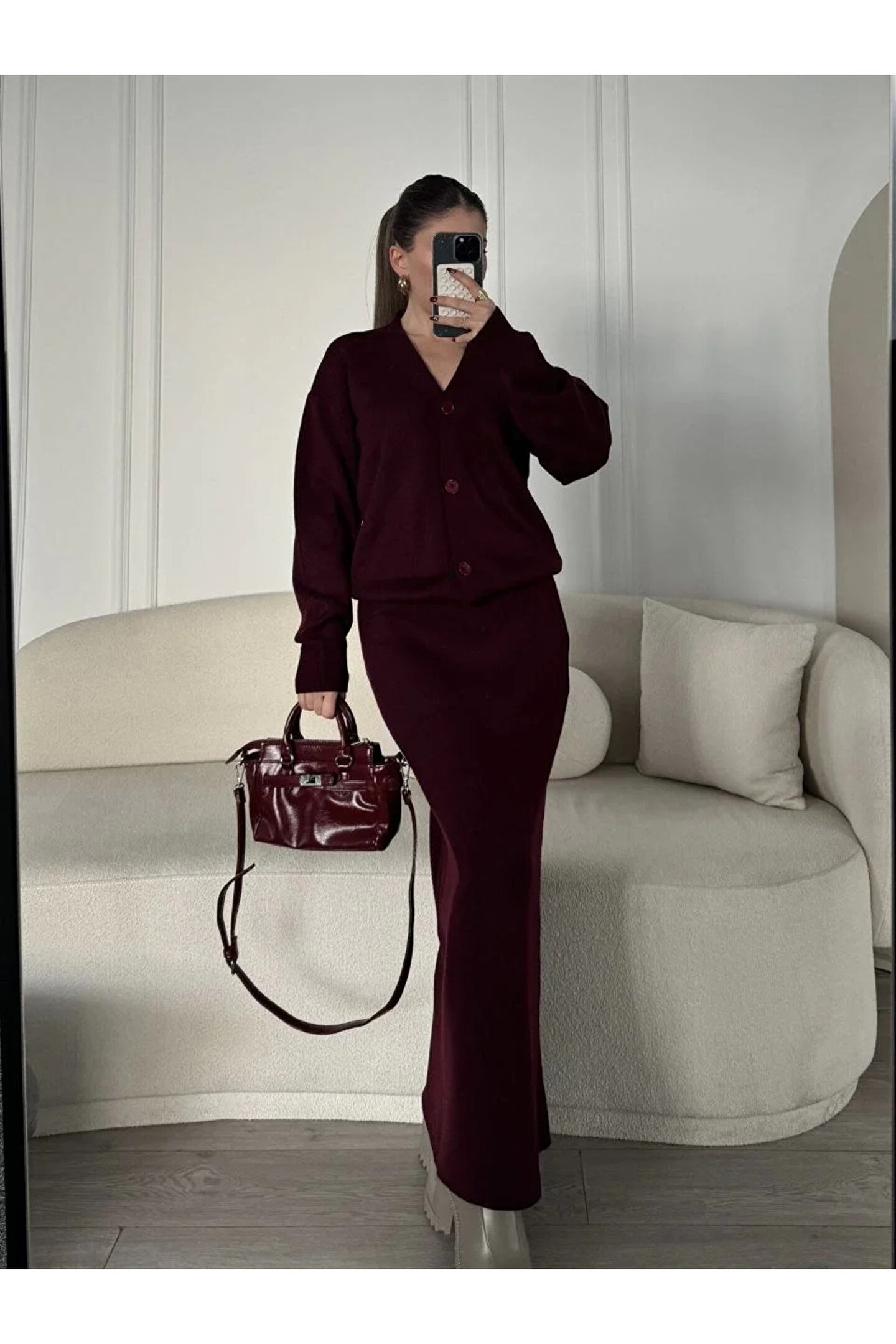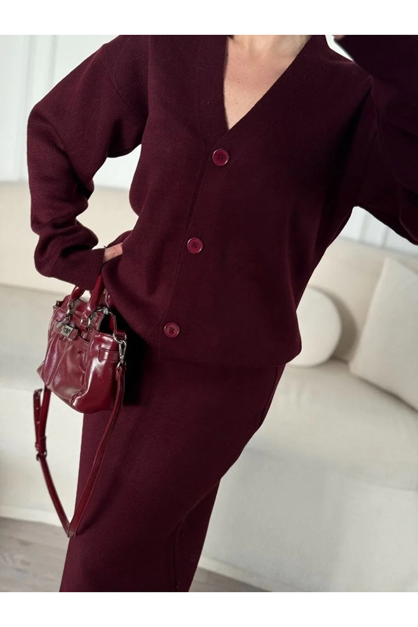 Ürün Adı: V Yaka 3 Düğmeli Hırka Takım Triko İkili Etekli - Bordo;