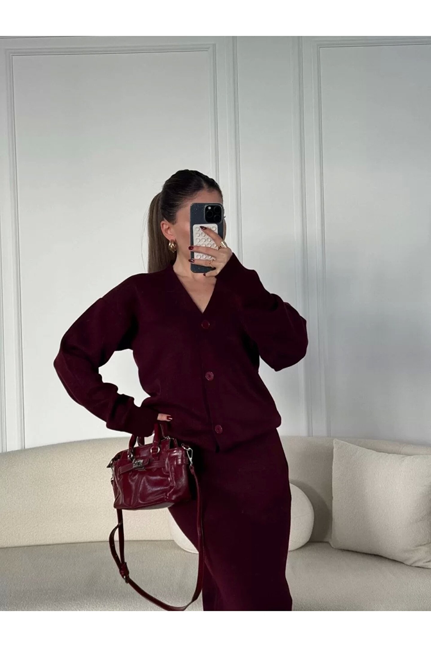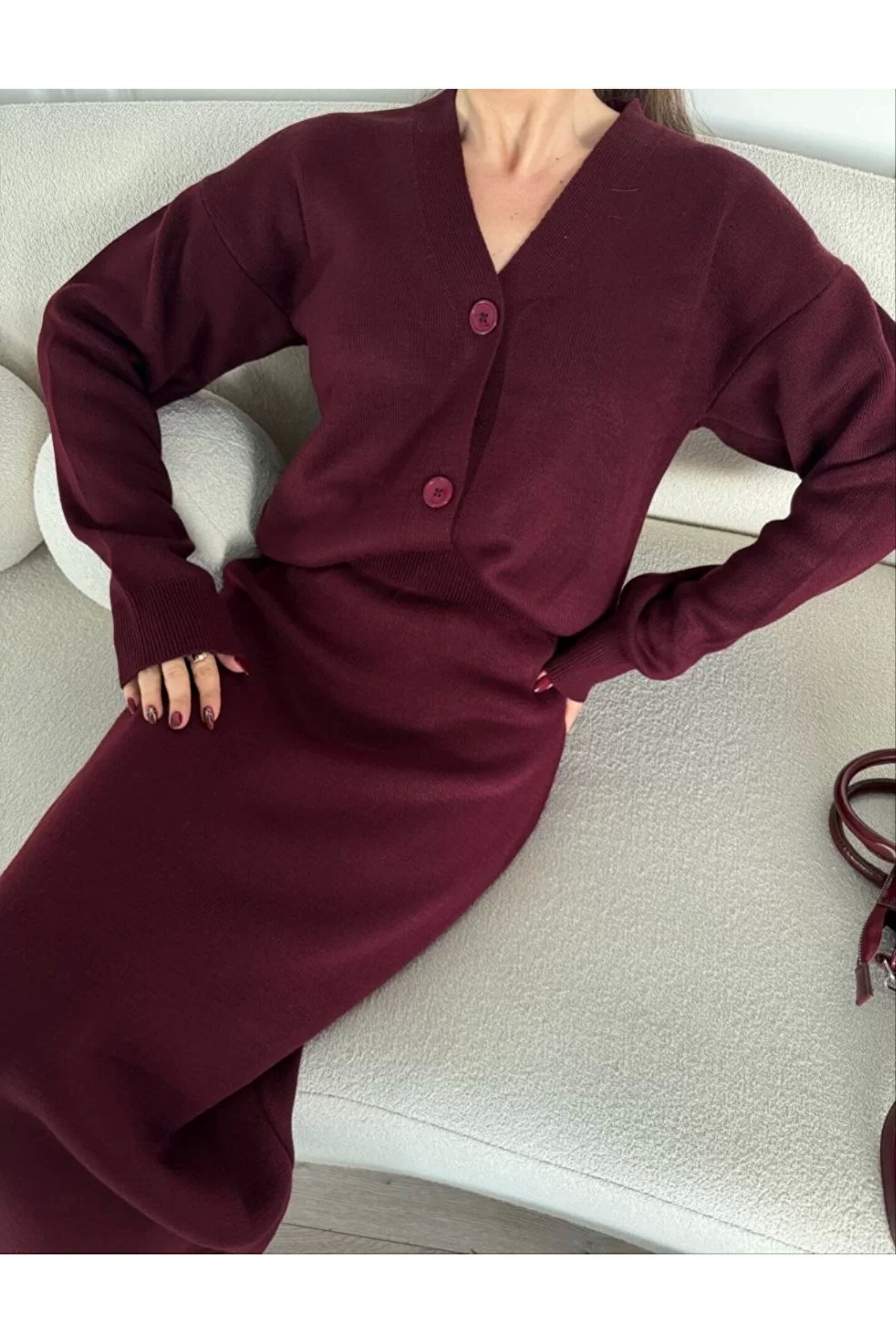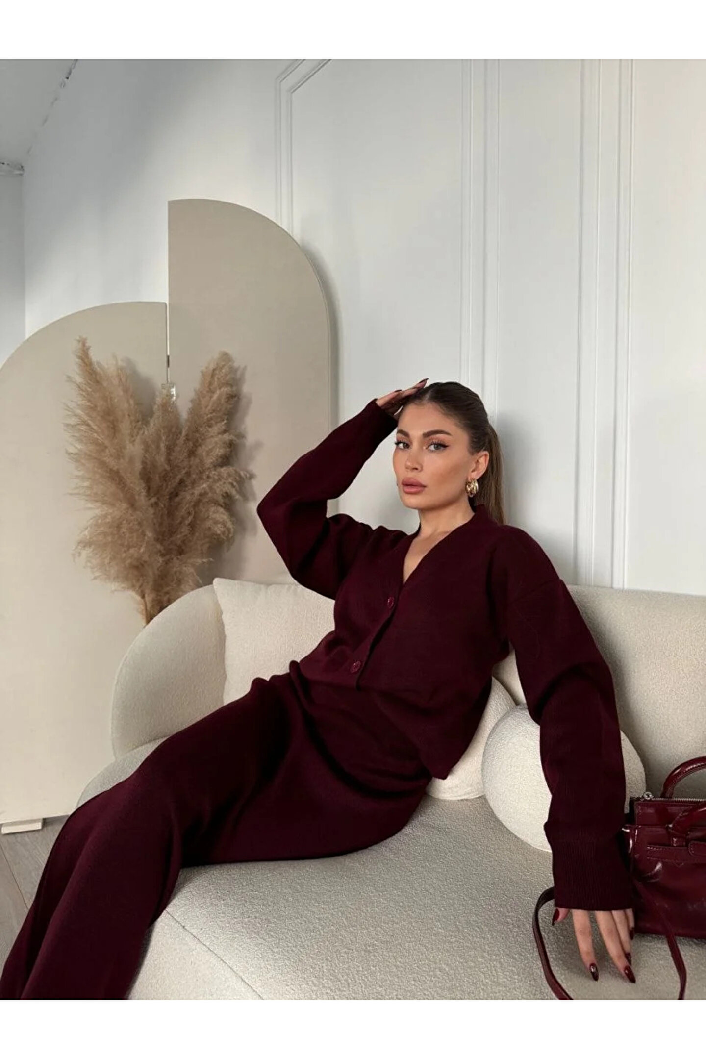 Ürün Adı: V Yaka 3 Düğmeli Hırka Takım Triko İkili Etekli - Bordo;