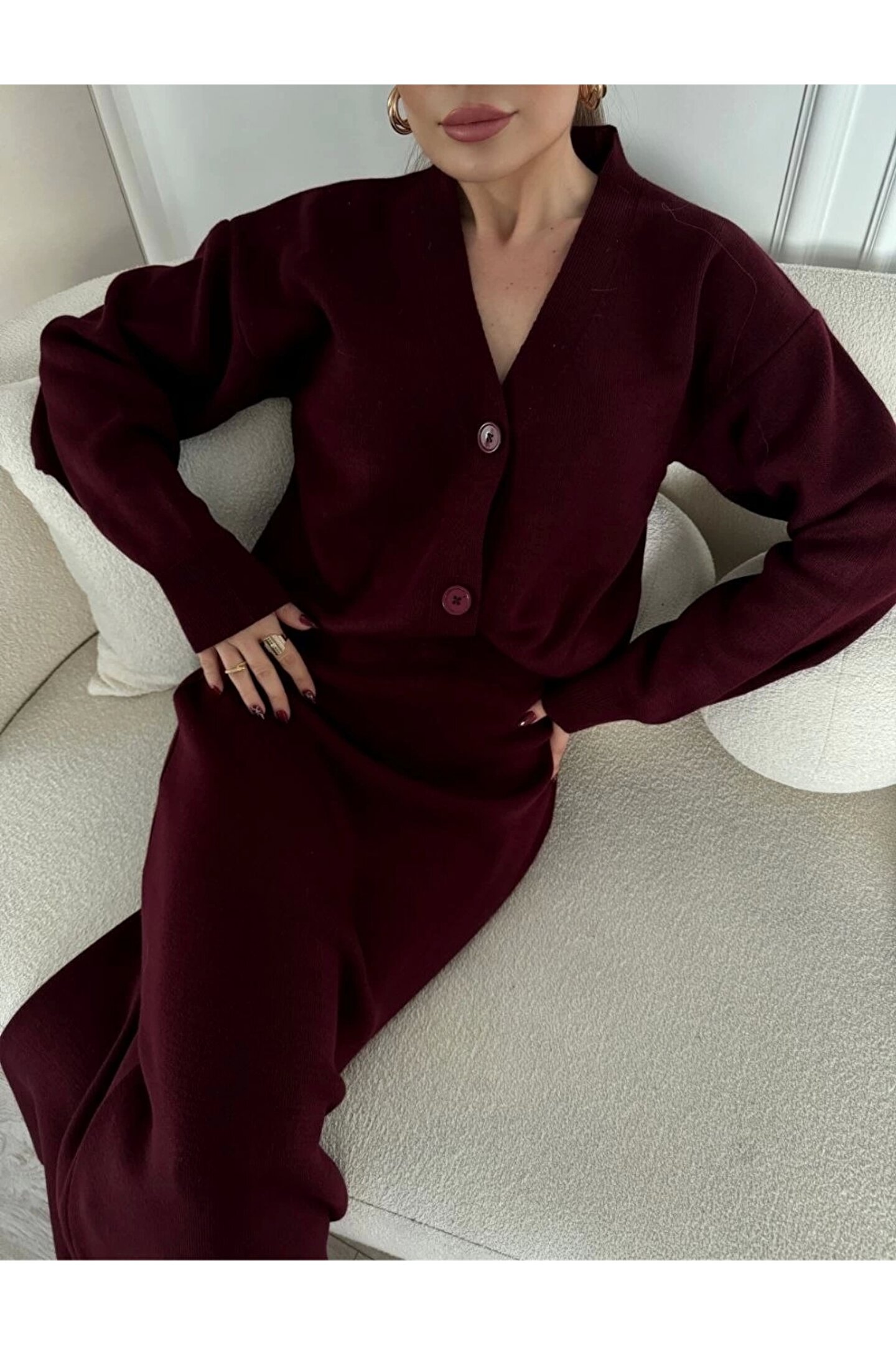 MODA Velmora Premium V Yaka 3 Düğmeli Hırka Takım Triko İkili Etekli - Bordo