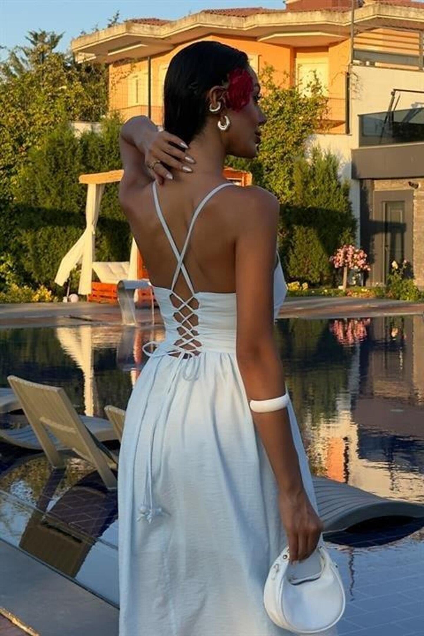 Sırtı Çapraz İpli Boncuk Detaylı Elbise 2902-08