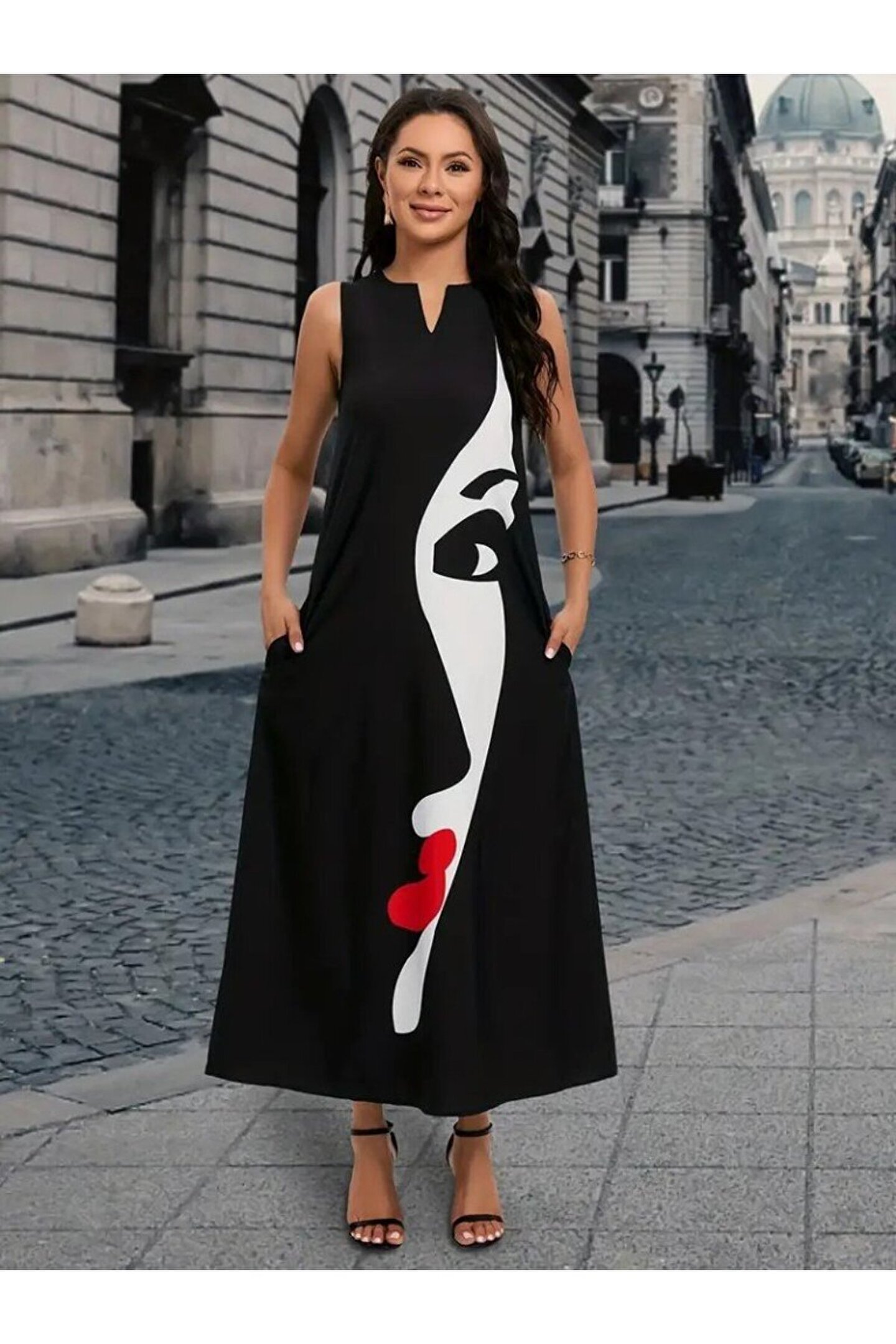 Kadın Sıfır Kol V Yakalı Kadın Yüz Desenli Süprem Elbise