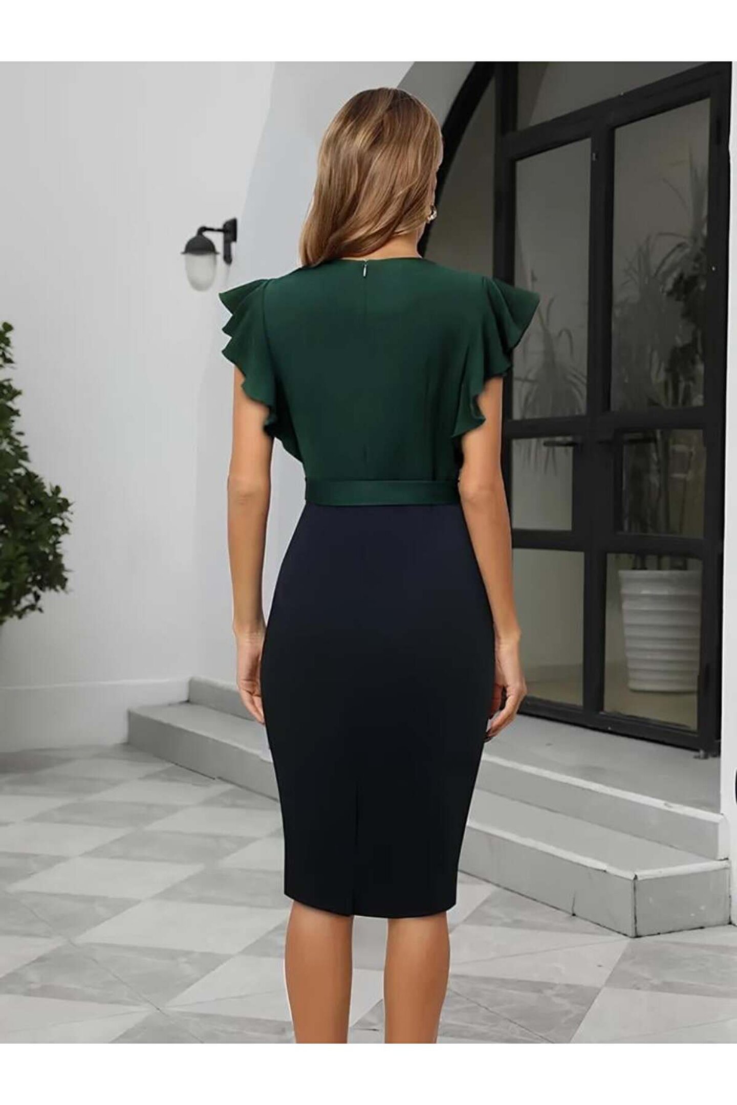 MODA55 Kadın Kısa Kollu Kruvaze Yaka Beli Kuşaklı Blok Desenli Ithal Krep Elbise