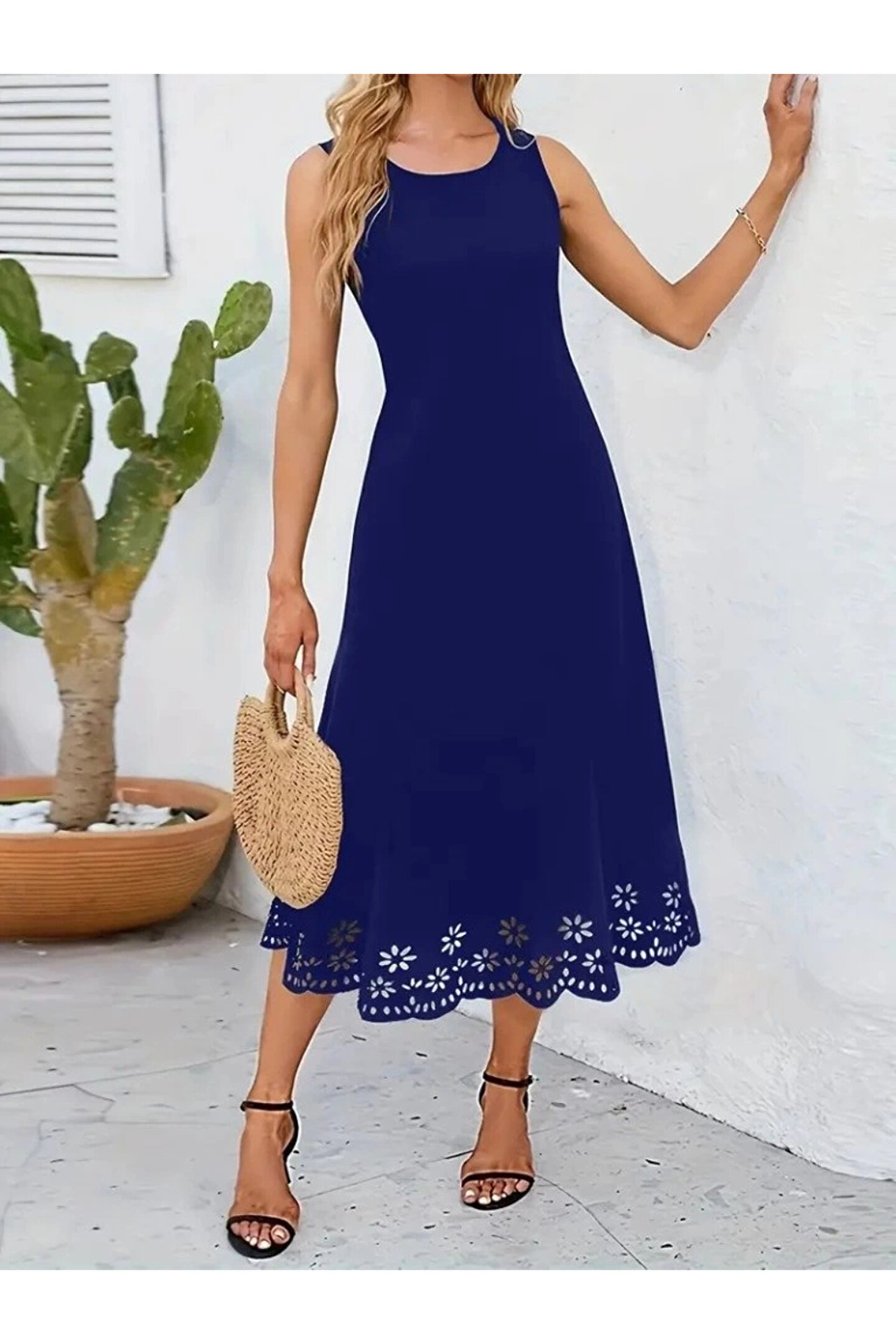 Kadın Kolsuz Etek Ucu Lazer Kesim çiçek Desenli Midi Boy Ithal Krep Elbise