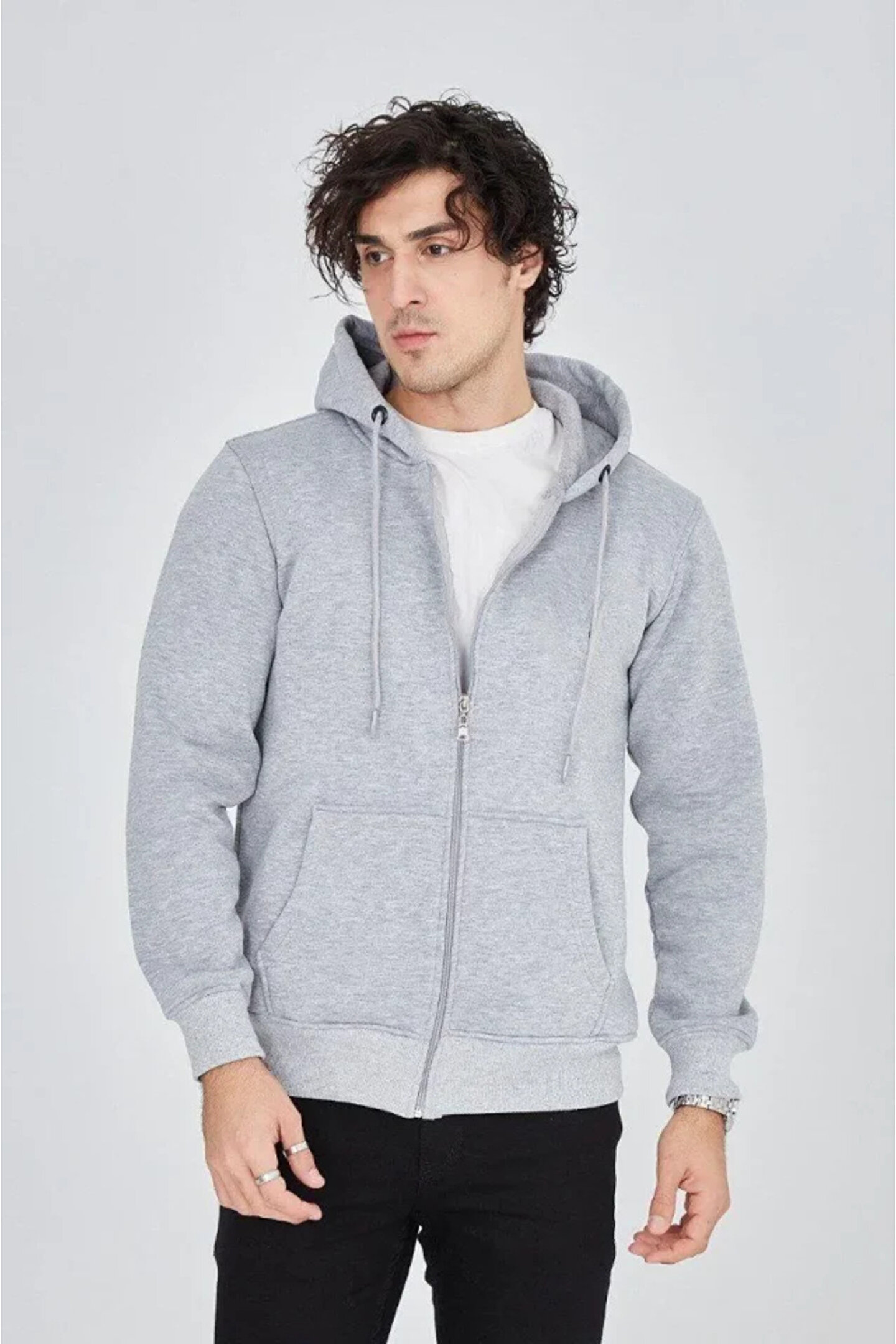 Erkek Kapüşonlu Düz Fermuarlı Hırka - Gri