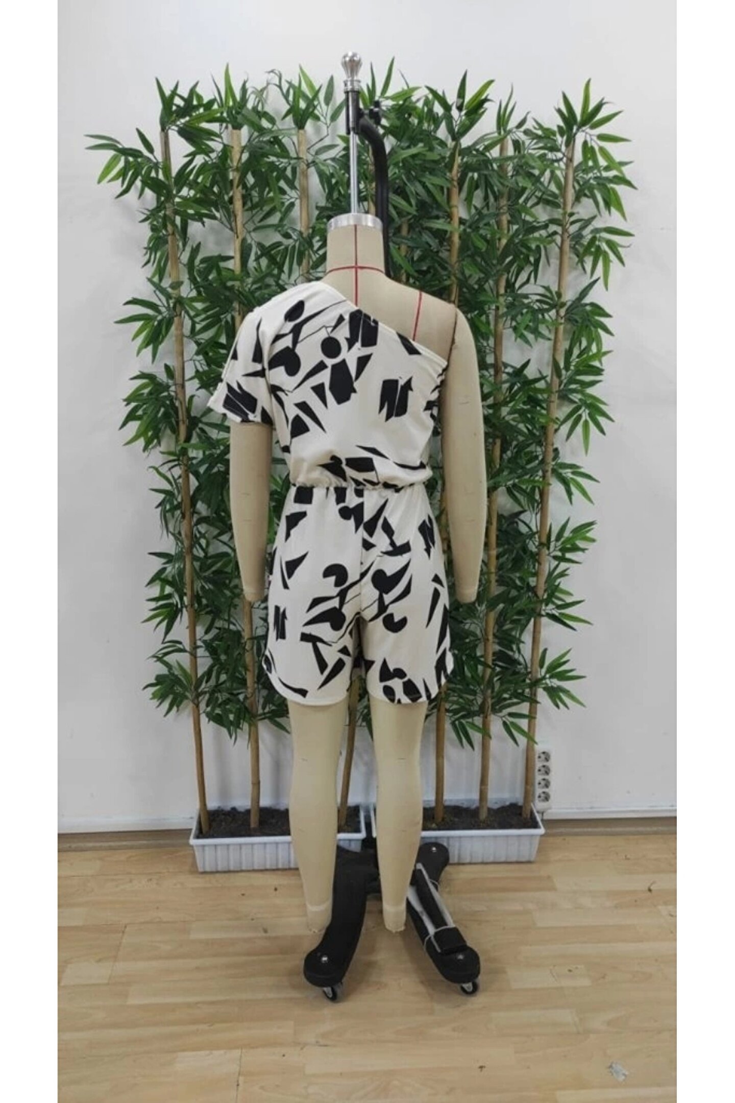 Kadın Tek Omuzdan Açık Beli Lastikli Desenli Süprem Tulum