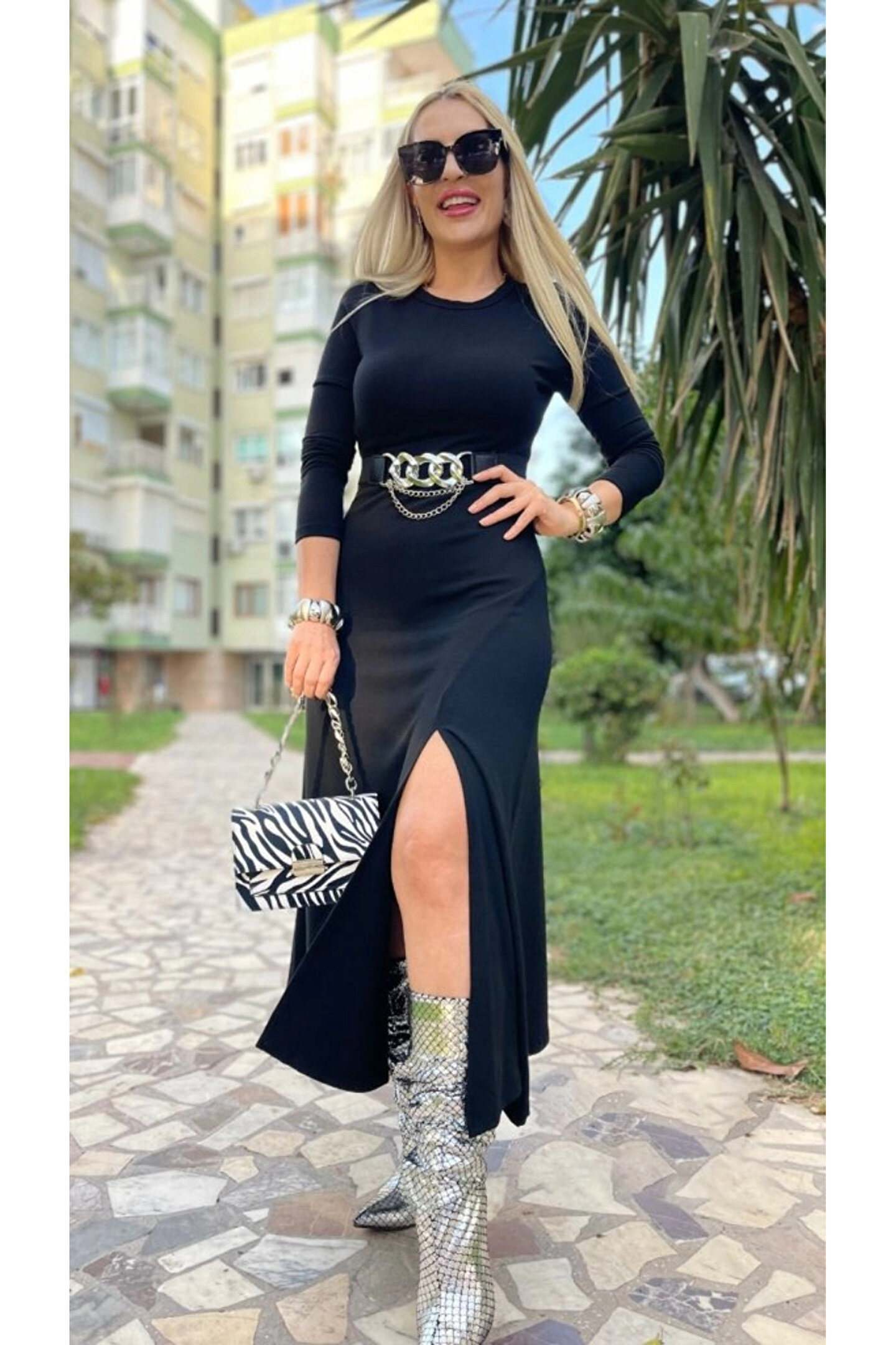 Kadın Uzun Kollu Bisiklet Yaka Yırtmaçlı Kemerli Uzun çilek Elbise