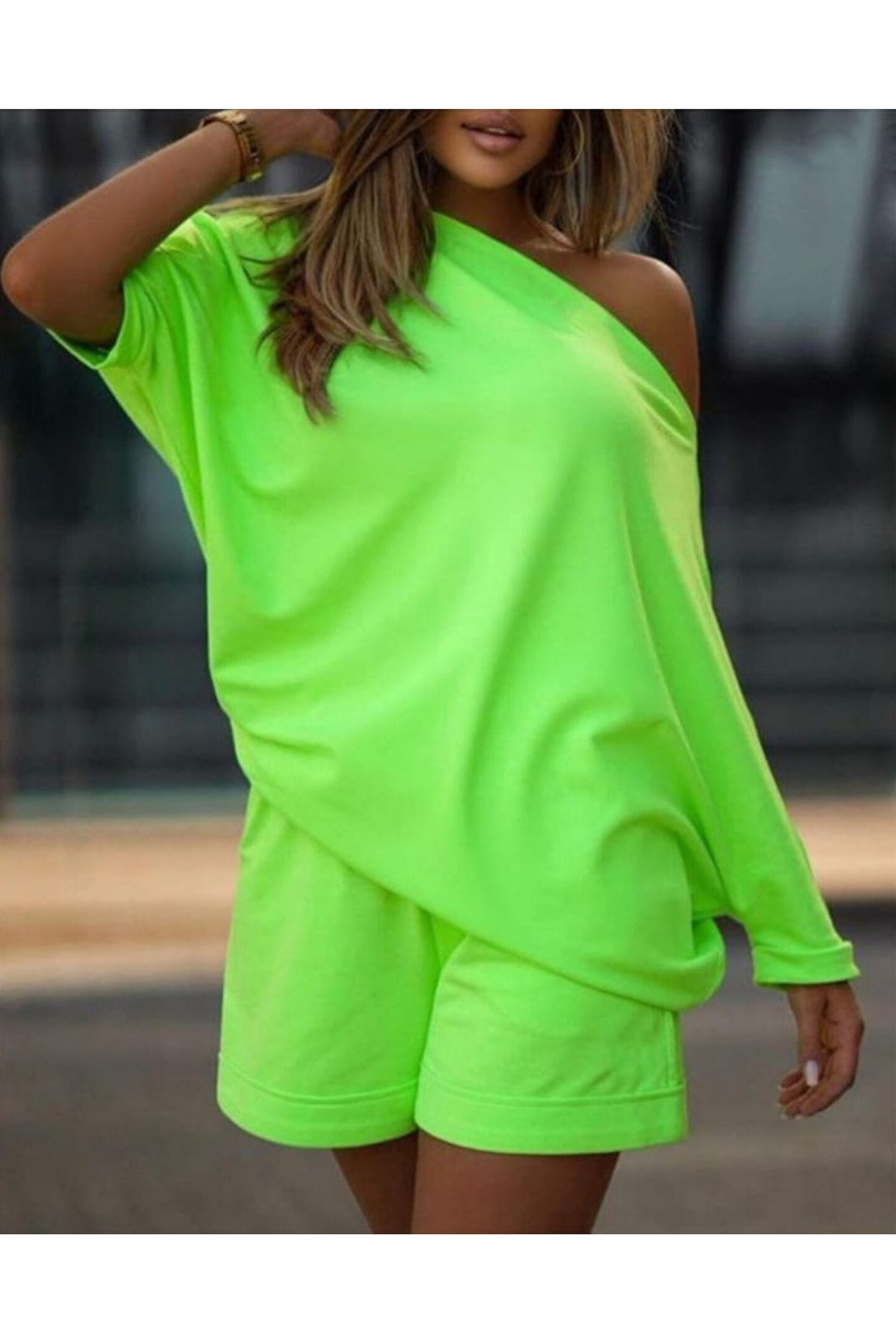 Kadın Kayık Yaka Salaş Iki Iplik Bluz Ve şort Ikili Takım