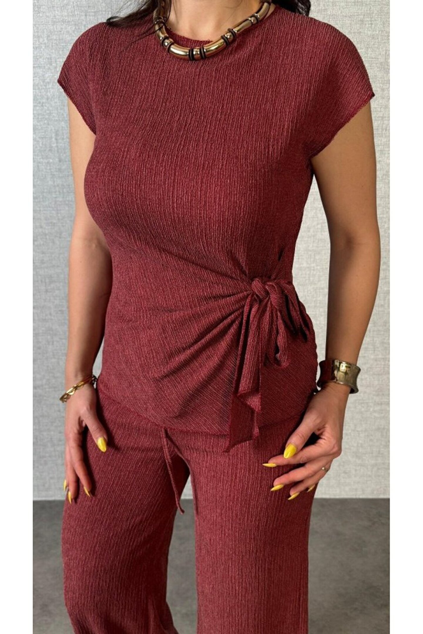 EQURİ Kadın Kısa Kollu Bisiklet Yaka Yandan Bağlamalı Bürümcük Bluz Ve Pantolon Ikili Takım