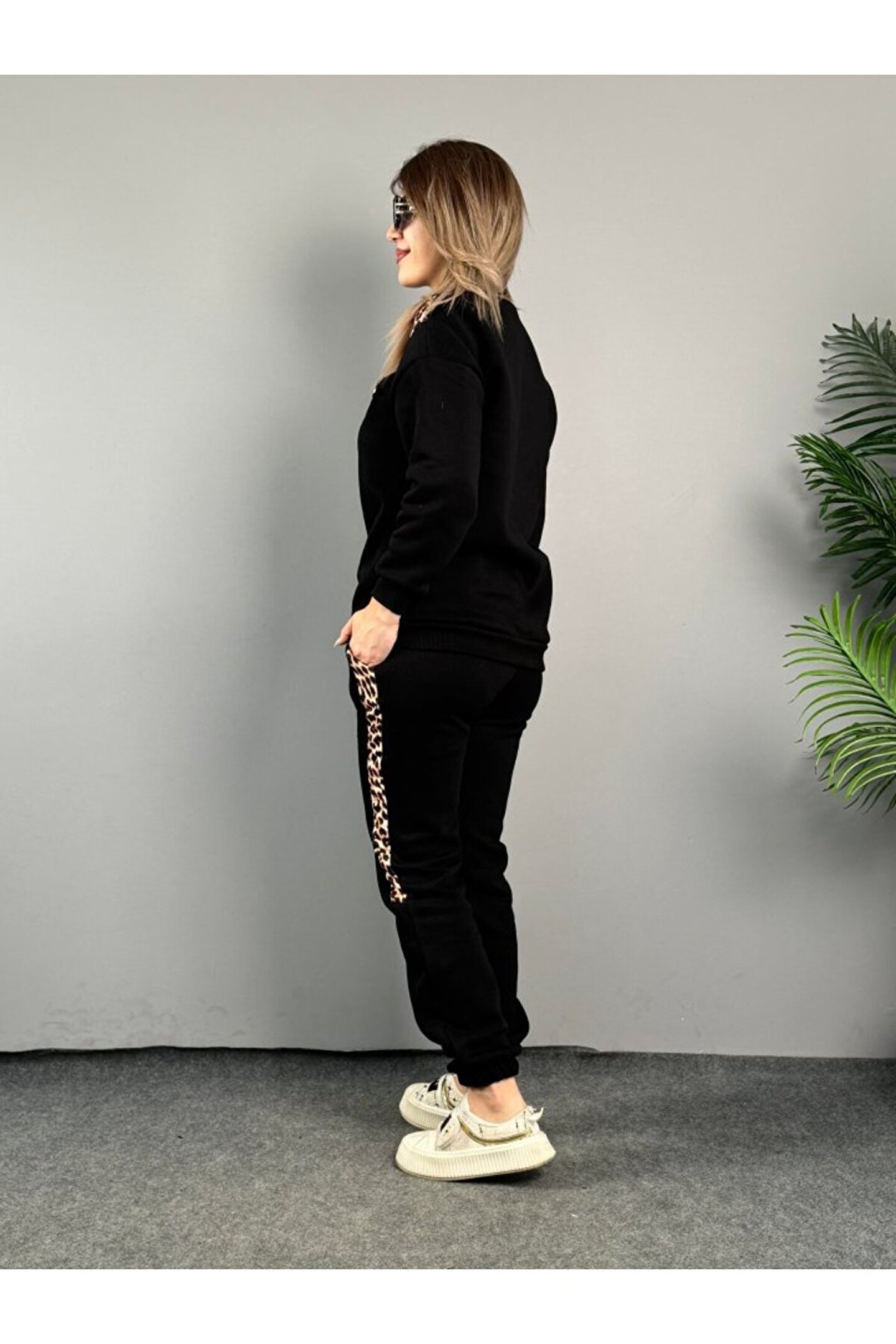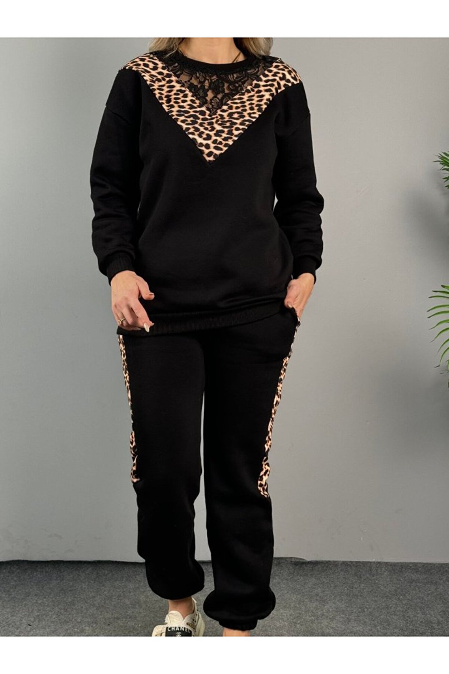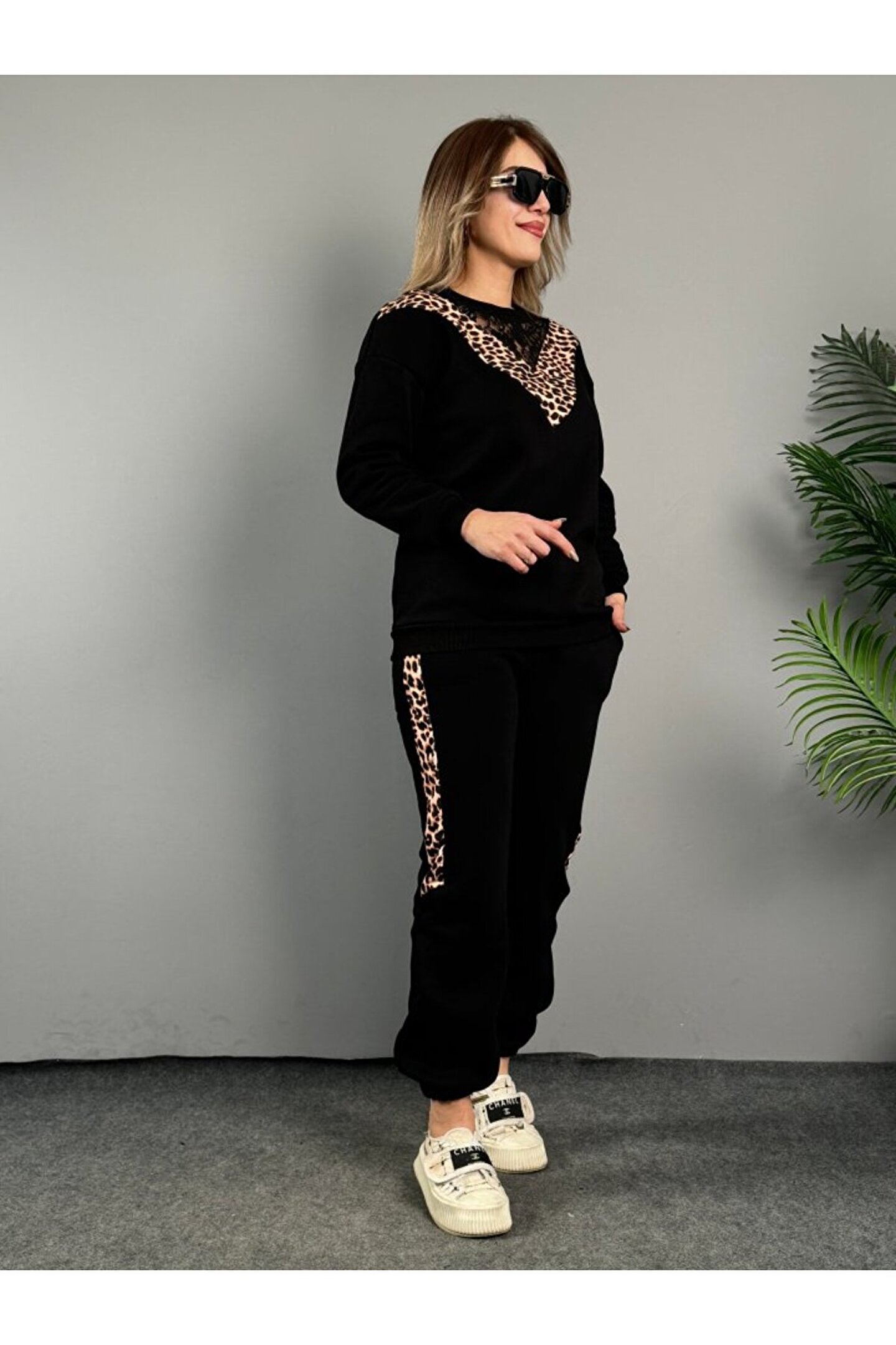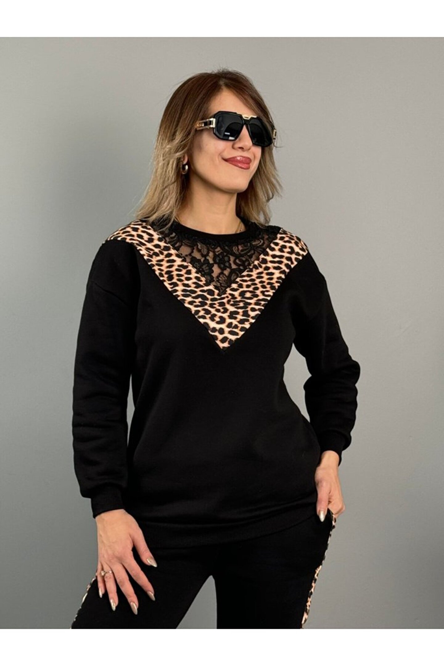 Modayakamoz Gökyüzü Moda Kadın üç Iplik Kumaş Leopar Desenli Dantel Detaylı Ikili Takım