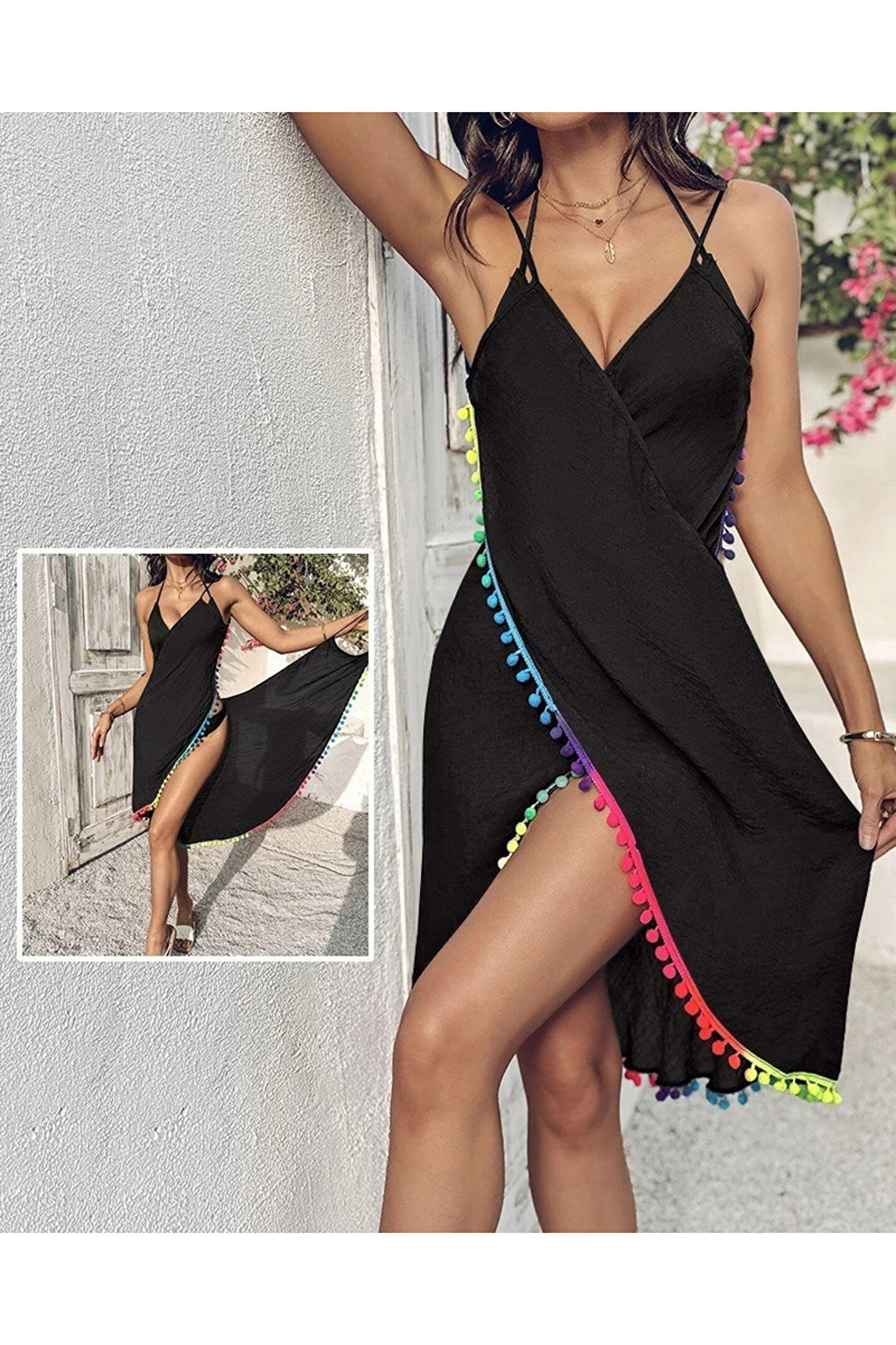 Kadın Askılı Derin V Yakalı çapraz Geçmeli Ponponlu Bürümcük Pareo