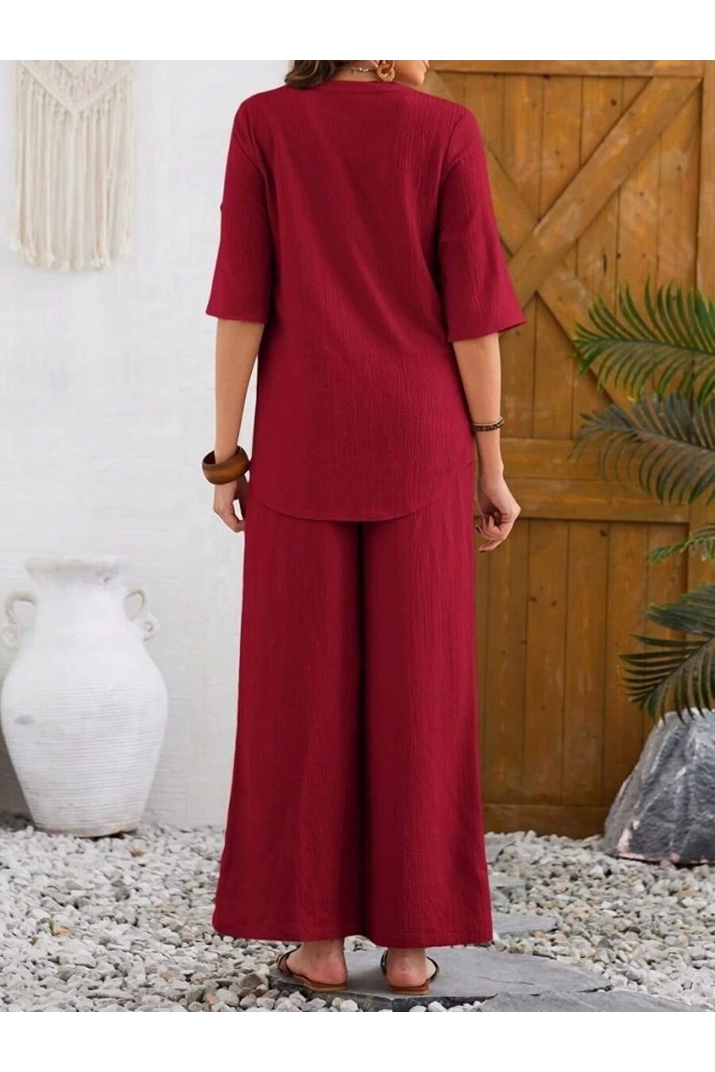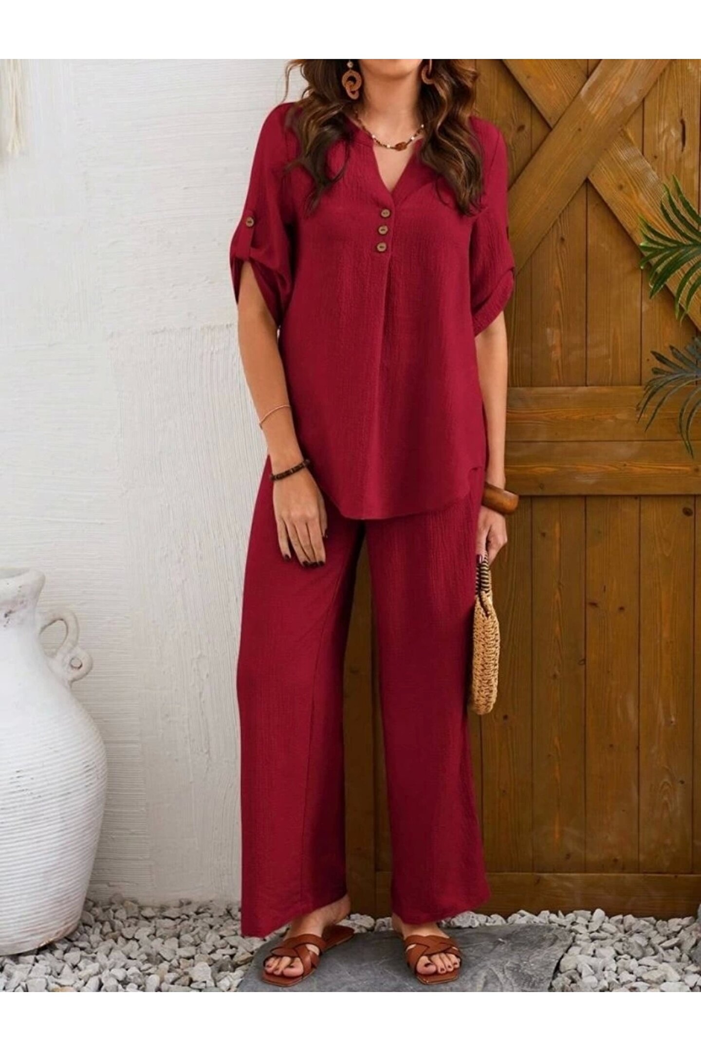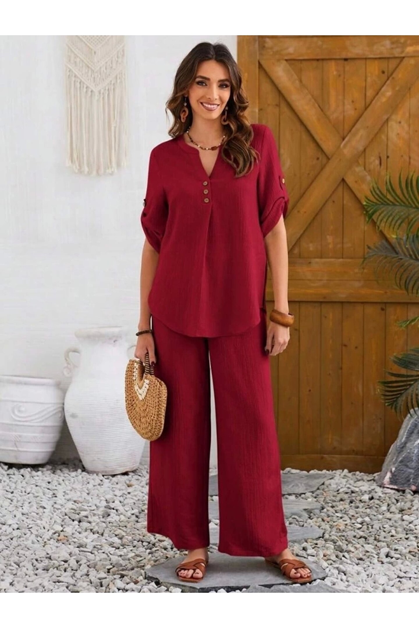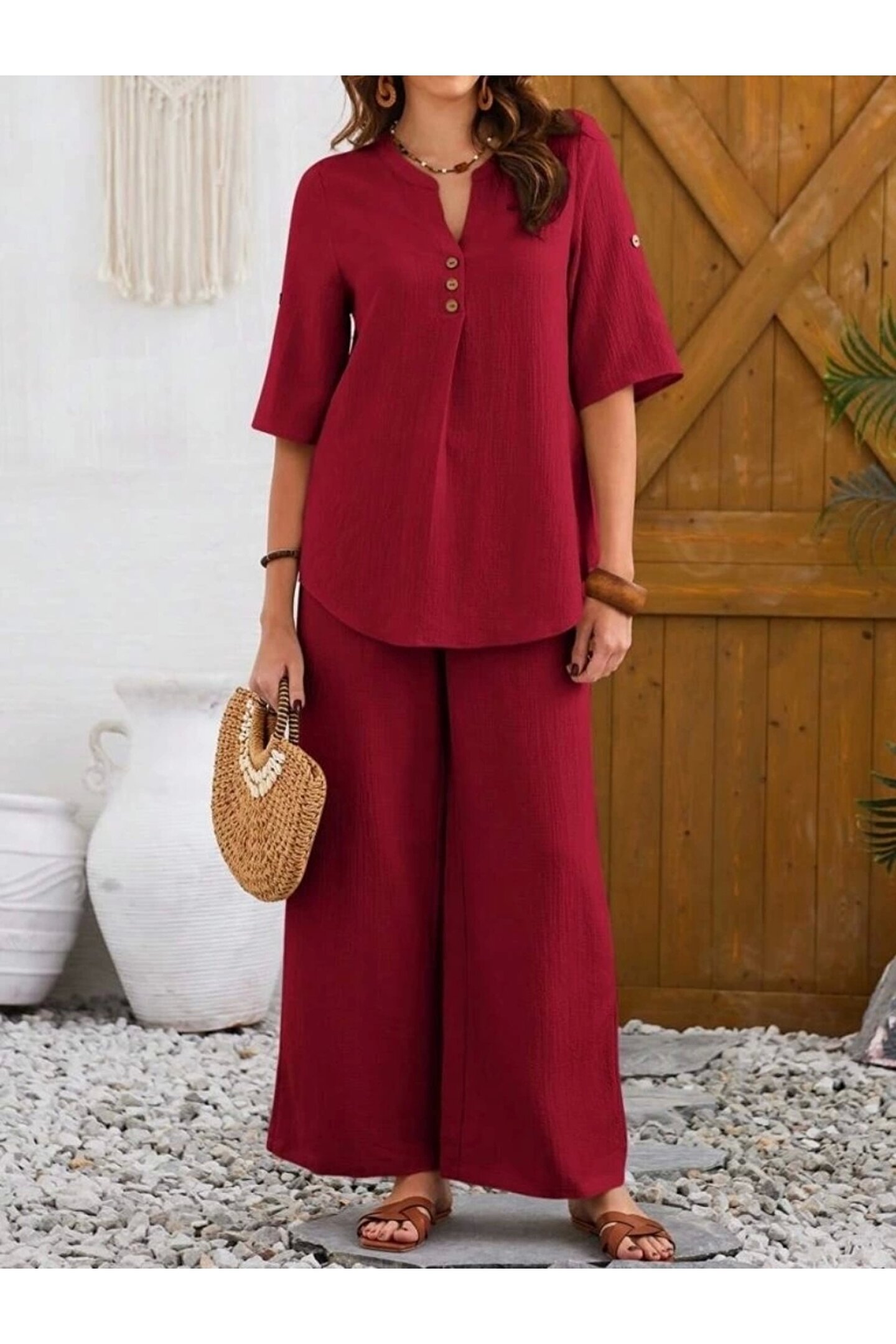 - Yaz ayları için ideal, hafif ve rahat bir kullanım sunan bürümcük kumaştan üretilmiştir.; - Gömlek yaka tasarımı ile şıklığı ve konforu bir arada yaşatır.; - Keten karışımının sunduğu nefes alabilirlik sayesinde gün boyu ferahlık hissi sağlar.; - Kırışmaya karşı dayanıklı yapısıyla bakımı kolaydır; sık yıkamalarda bile formunu korur.; - Cepsiz tasarımı pratik kullanım imkanı sunarken, astarsız yapısıyla minimalist bir görünüm kazandırır.; - 30 derecede yıkanabilme özelliğiyle bakımının kolay olduğu anlamına gelir; böylece zamandan tasarruf edilir.; - Gömlek yakası detayı ile modern ve zarif bir stil oluştururken, düğmeli kesimiyle feminen dokunuşlar ekler.; - Oversize silueti sayesinde rahat hareket etme özgürlüğü tanırken geniş paça tasarımı trend bir görünüm sunar.; - Yarım pat düğme kapama şekliyle hem fonksiyonel hem de estetik bir detay olarak öne çıkıyor.; - Cool & comfort persona'sıyla günlük kullanıma uygunluk göstererek her ortamda rahatlıkla tercih edilebilir.; - 2 parçadan oluşan set halinde sunulan bu takım, kombin derdi olmadan şık olmanızı sağlar.; - Düz deseniyle sadelikten yana olanların beğenisini kazanacak şekilde dizayn edilmiştir.; - Duble kol tipine sahip olmasıyla mevsimsel geçişlerde ideal konforu sunarken pamuklu materyali cildinizle dosttur.; - Denim kumaşı sayesinde dayanıklılığı arttırarak uzun süreli kullanım vaat eder.; - Türkiye menşeli oluşuyla yerel üretim avantajlarından faydalanmanız mümkün olurken yetişkin yaş grubuna hitap eder.; - Casual/günlük ortamlarda rahatlıkla tercih edebileceğiniz bu takım, casual tarzınıza eşlik ederken şıklığınızdan ödün vermezsiniz.; - Duble kol detayı modern çizgilere sahipken kısa kol boyu yaz ayları için idealdir.