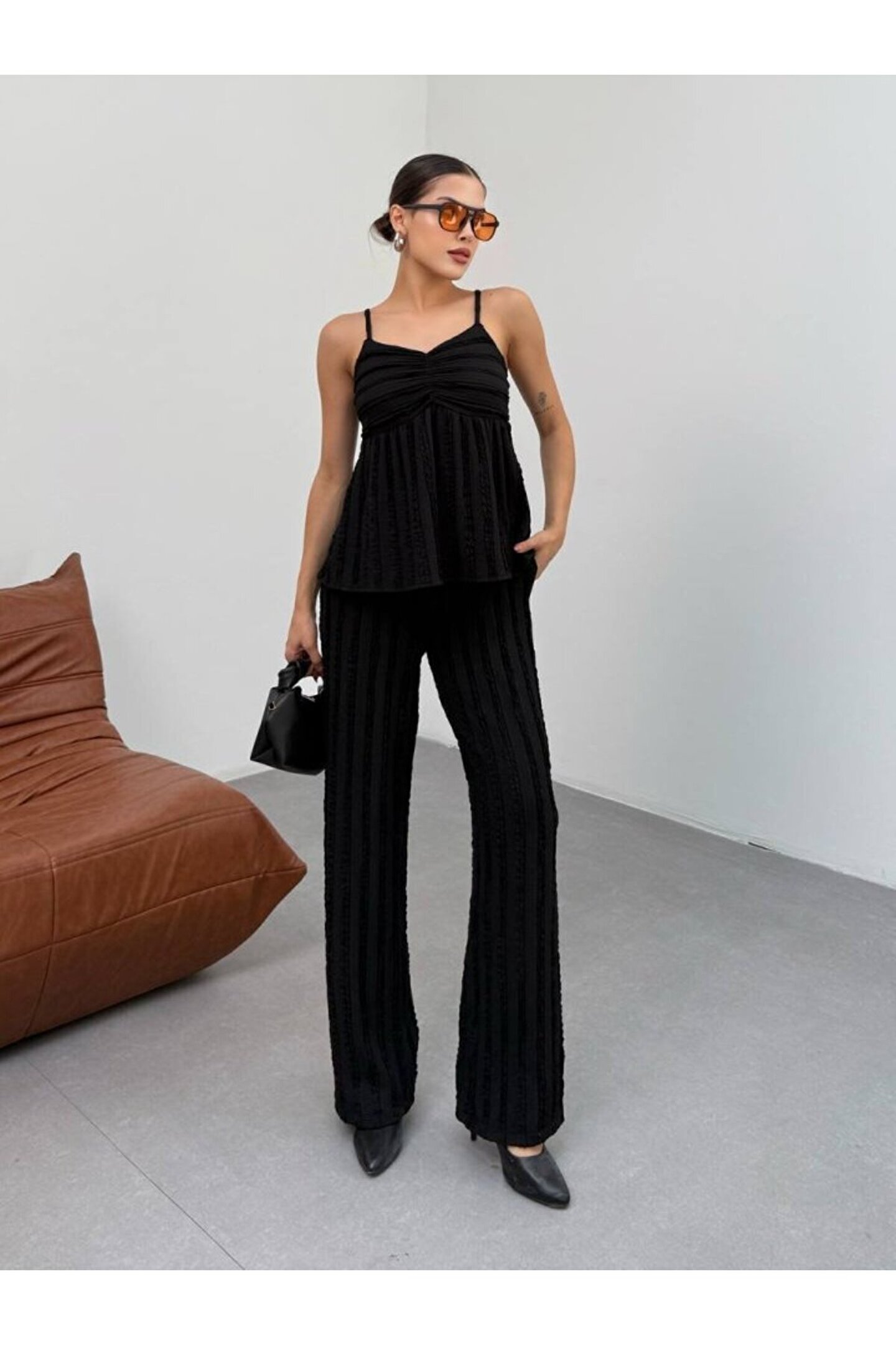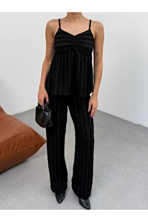 - Zarif siyah dokulu askılı üst ile bol paça pantolonun şık kombinasyonu, günlük kullanım için idealdir.; - Kalp yaka tasarımıyla feminen bir görünüm sunar ve rahatlığı ön planda tutar.; - Çift cepli yapısı pratiklik sağlar; küçük eşyalarınızı yanınızda taşımanız için kolaylık sunar.; - Kemersiz tasarımı sayesinde farklı stillerle uyum içinde olabilirsiniz.; - Ek özelliklerden yoksun olması, sadelikten yana olanların tercihi haline getirir.; - Flare kesimiyle modern ve trend bir siluet çizerken, çizgili deseniyle dinamik bir stil vurgular.; - Yetişkin kadının zarafetine hitap eden bu takım, her ortamda şıklığınızı korumanızı sağlar.; - İnce askılı kol tipi yaz ayları için serinlik ve konfor sunarken, askılı boyu omuzları serbest bırakarak rahat hareket etme imkanı tanır.; - Pamuklu materyali cildinizle dosttur ve gün boyu nefes alabilen yapıya sahiptir.; - Casual tarzıyla günlük giyimde rahatlıkla tercih edebileceğiniz bu takım, hem evde hem de dışarıda keyifle kullanılabilir.; - Bluz-pantolon alt-üst takımı olarak tasarlanmıştır; böylece tek parça olarak da kombinlenebilir veya ayrı ayrı giyilebilir.