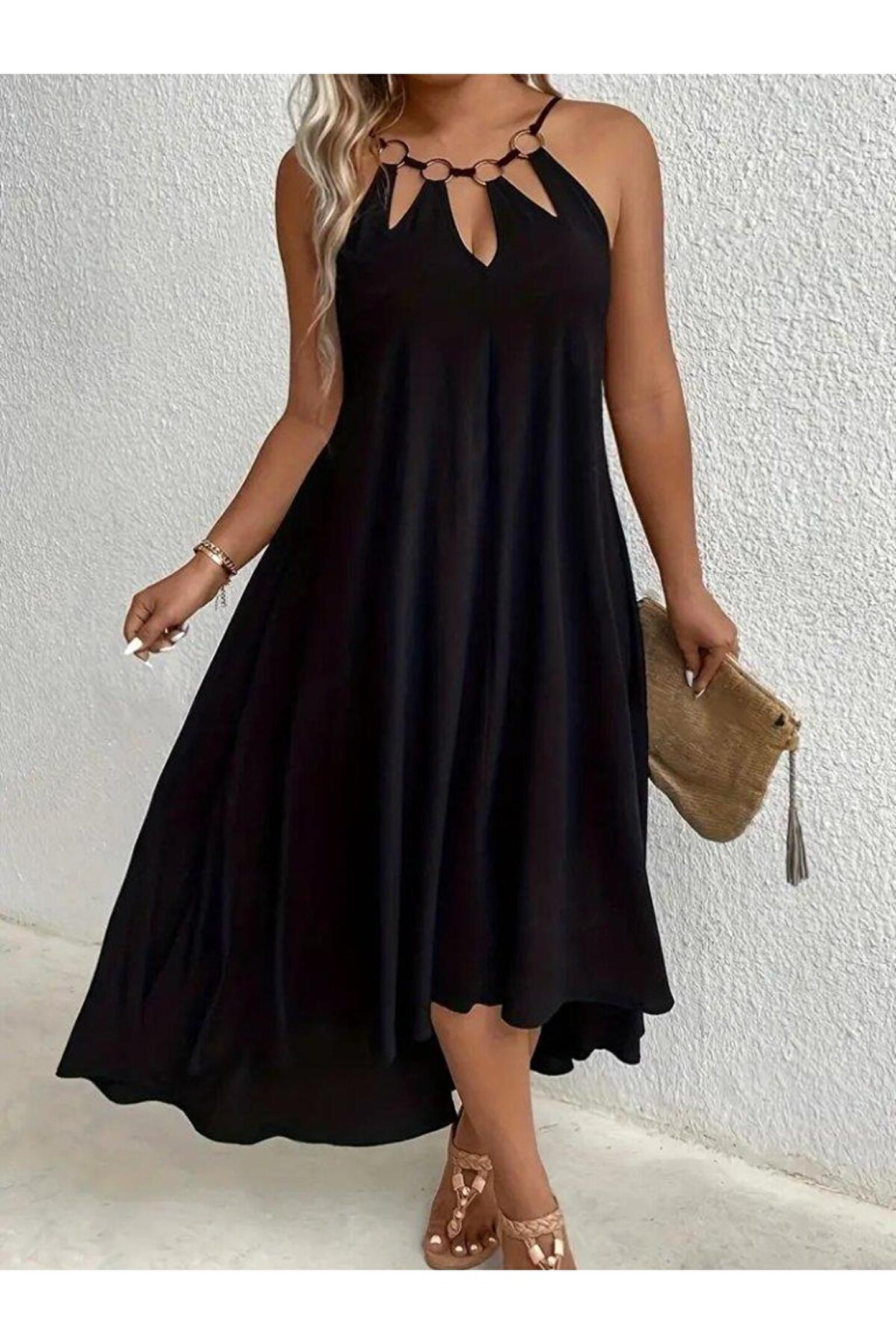 Kadın Boyundan Askılı Damla Detaylı Halkalı Asimetrik Kesim Viskon Elbise