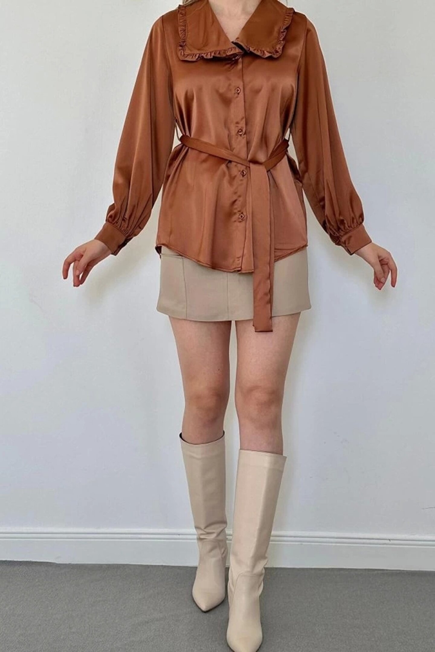 Kahverengi Yakası Fırfırlı Kuşaklı Saten Gömlek