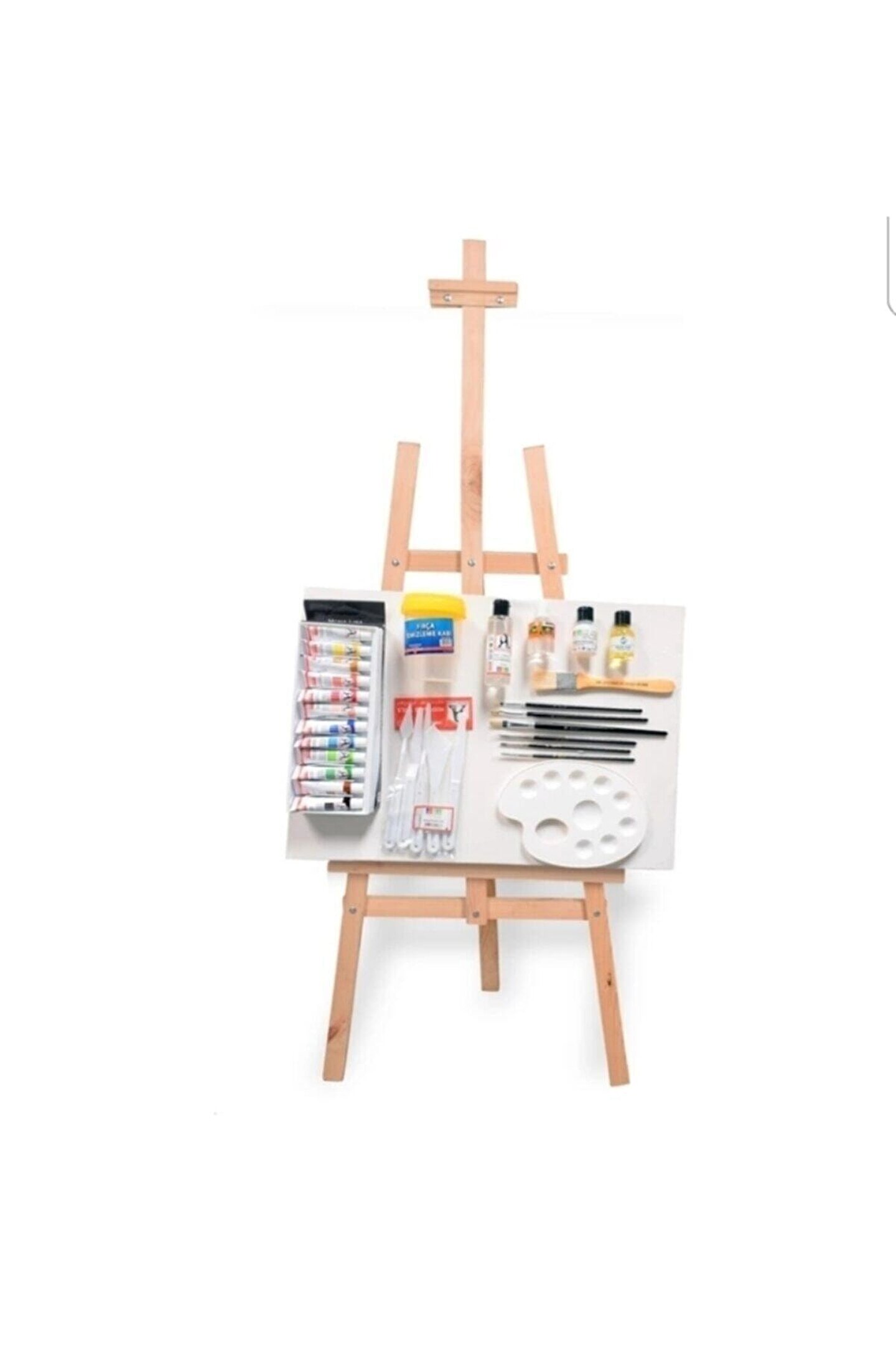 Monalisa yağlı boya başlangıç seti ahşap şövale 175 cm Ahşap ayaklı şövale 175 cm Tuval 35x50 cm Monalisa yağlı boya 12renk x 12 tüp Kokusuz terebentin Resim yağı keten yağı 25 ml Resim verniği 25 ml Fırça temizleyici jel 70 ml Palet plastık 8 göz 20 cm Sivri uç fırça seti 1; 3; 5 Yassı uç fırça seti 2; 4; 6 Zemin fırça no:3 Spatul set plastık 5 'li Fırça temizleme kabı ;