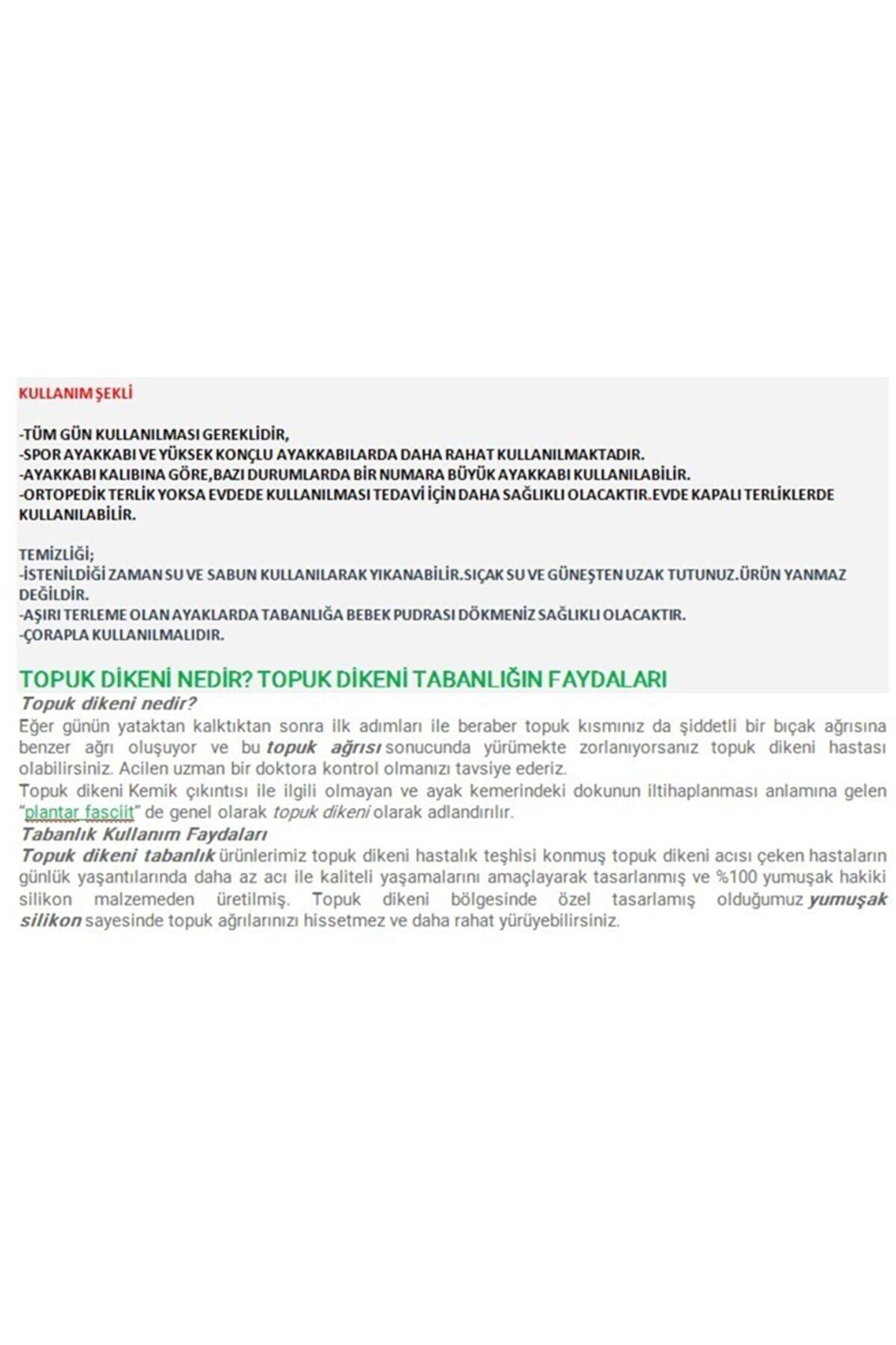Tam Ortopedik Anatomik Silikon Ayakkabı Tabanlığı Topuk Dikeni Tabanlık Topuk Dikeni Rahatsızlıklığını Ice Men Tam Ortopedik Anatomik Silikon Ayakkabı Tabanlığı Icemen Tam Ortopedik Anatomik Silikon tabanlık Tabanlık Ayakkabı TabanlığıIcemen Ortopedik Spor Tabanlık • ORTOPEDİK SİLİKON TABANLIK BEDEN ÖLÇÜSÜ XS:36-37 S: 38-39 M:40-41 L: 42-43 XL:44-45 • Özellikle uzun süre ayakta kalmak zorunda olanlar, askerler, ayakta çalışanlar için şok emici yapısı ile yorgunluğu en aza indirir .•• Tasarımı Ayak sağlığı uzmanları tarafından onaylanmıştır. •• Kıvrımlı Destek çukuru ile rahat yürüme sağlar. •• Şok emici yapısı ile uzun süreli yürüyüşlerde ve ayakta durma durumunda konfor sağlar .•Topuk dikeni tabanlar için uygundur • Silikon basınç ve vurma bölgeleri ile bulutların üstünde yürüme hissi yaratır. Görseldeki ürünün aynısı gönderilir.
