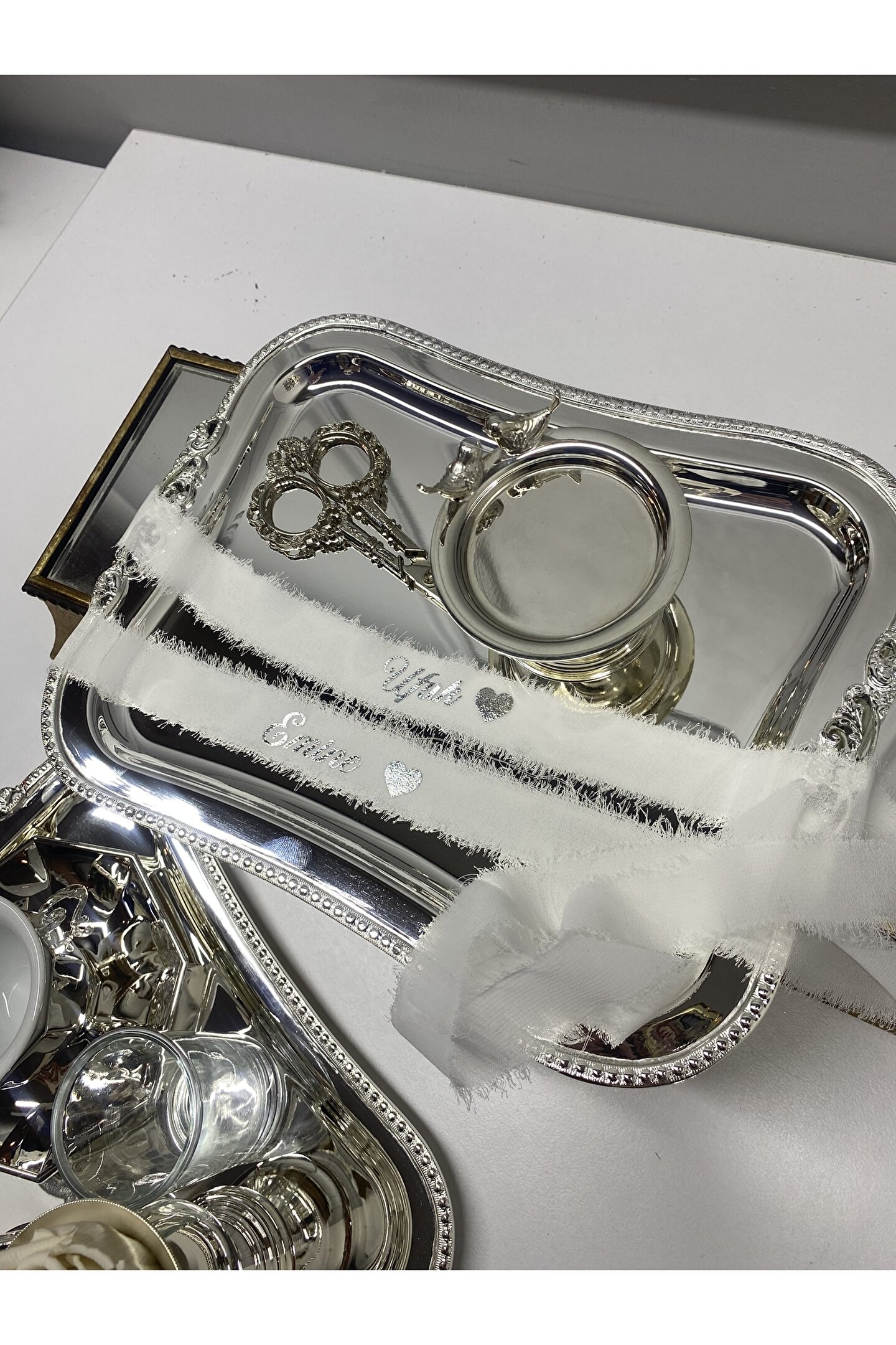 Ürün 1m -1,10cm uzunluğundadır . ; Krem ipek kurdele üzerine gümüş baskılı yapılmıştır. ; Yüzükleriniz cırtı ile kolaylıkla takılabilmektedir. ; Sipariş verdikten sonra sipariş numaranız ile birlikte üzerine yazılmasını istediğiniz isimleri satıcıya sor kısmında bize iletmeniz durumunda siparişiniz istediğiniz gibi hazırlanacaktır.;