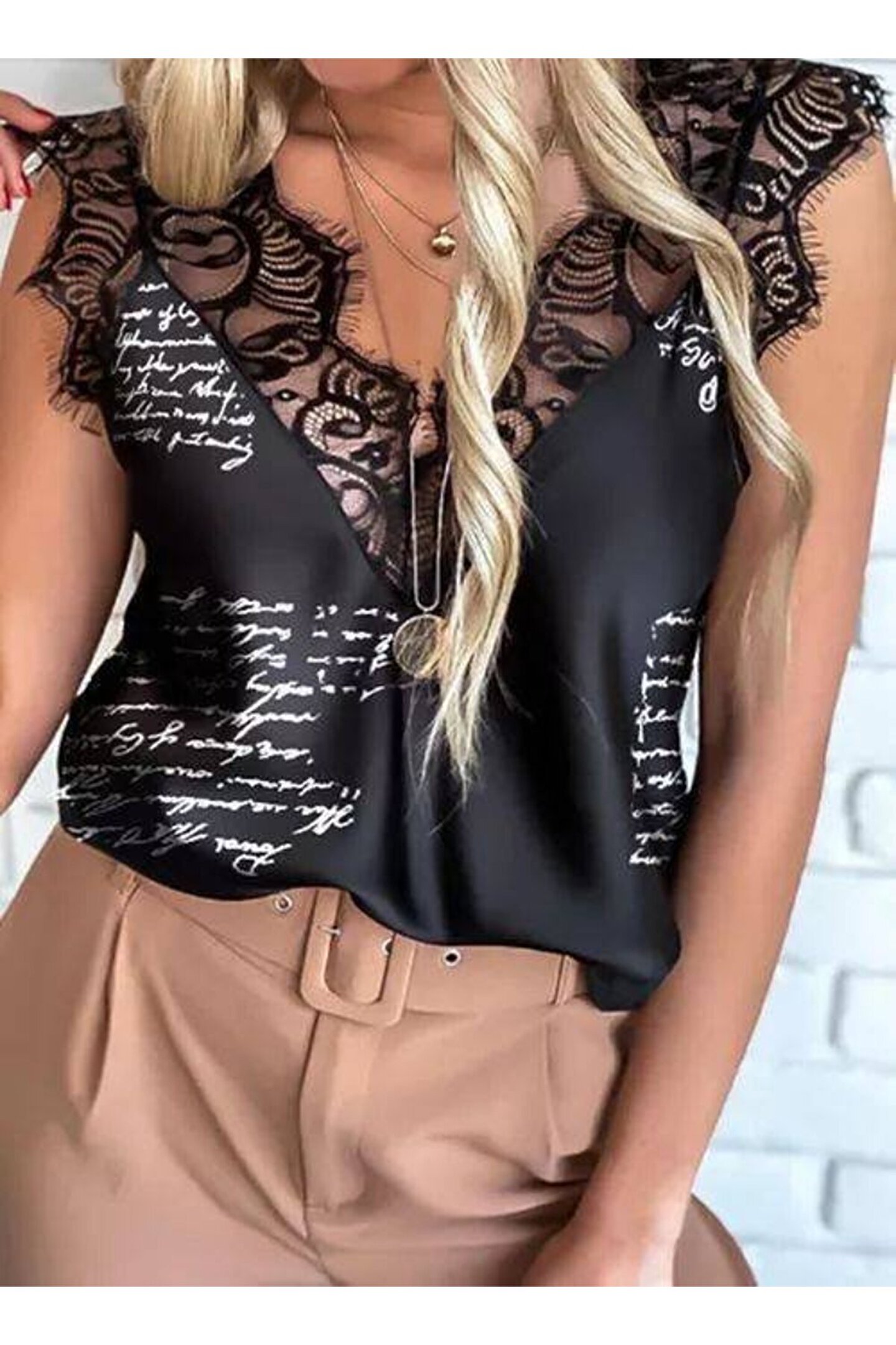 MRA Fashion Myterrax Kadın Mektup Desenli Dantel Detaylı Mikro Kumaş Bluz