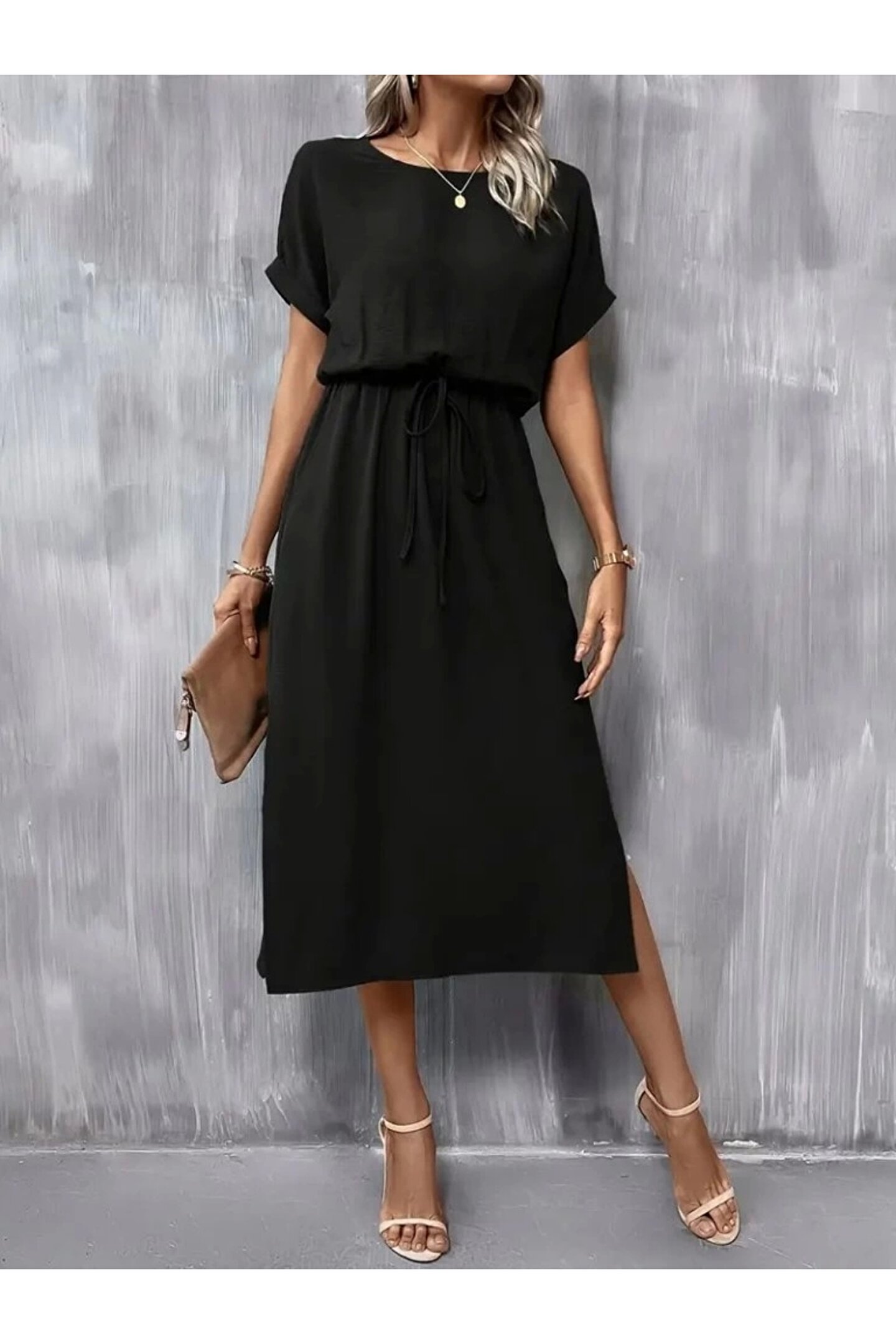 Myterrax Kadın Kısa Kollu Yakası Açık Belden Bağlamalı Yırtmaçlı Viskon Elbise