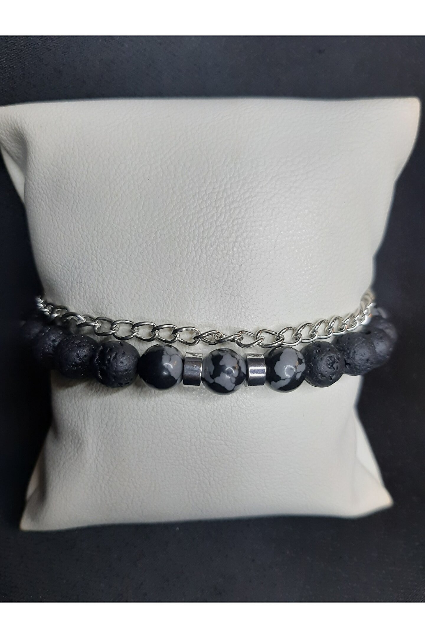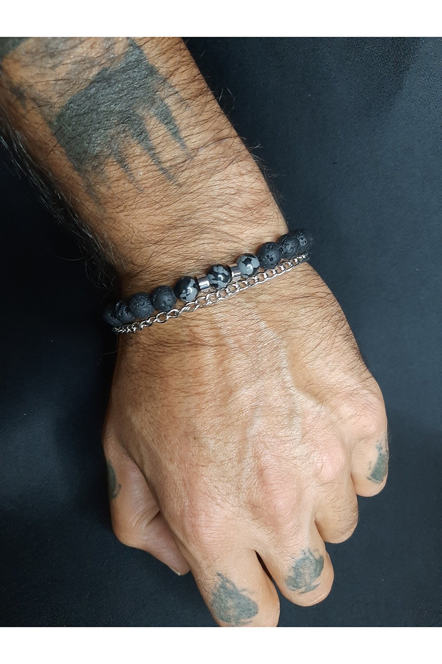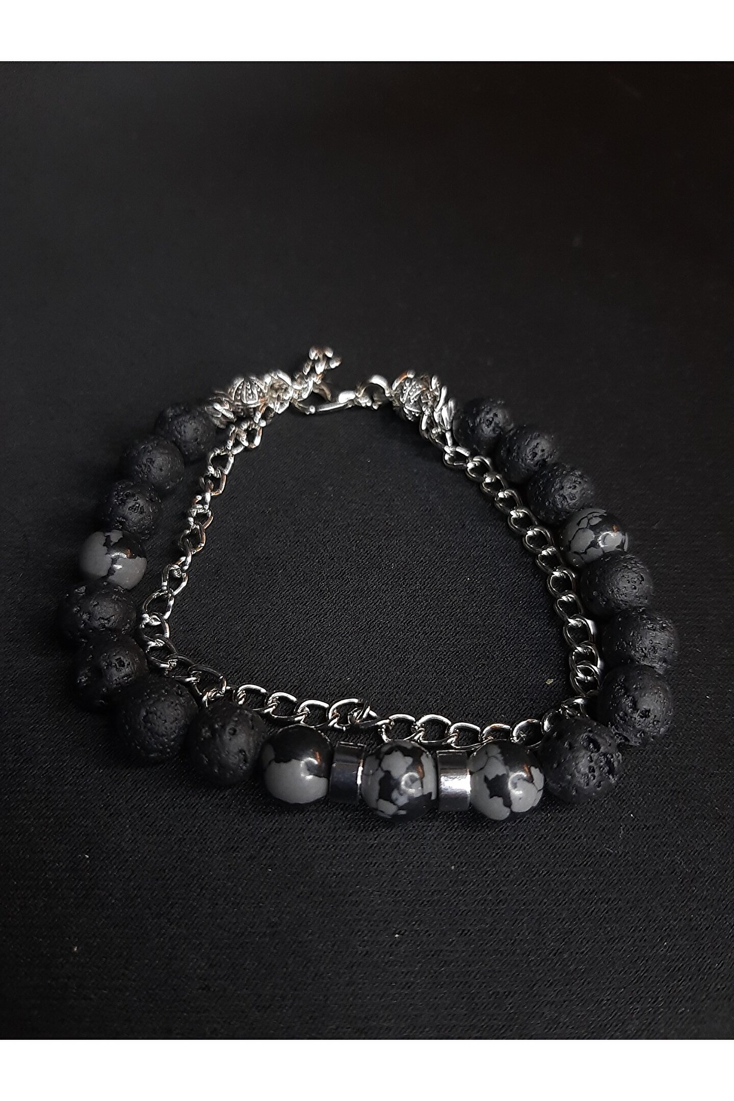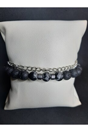 - Doğal taş kullanımı sayesinde her bileklik benzersiz ve otantik bir görünüm sunar.; - Siyah lav taşı ve füme akik taş detayları ile şıklığı ve zarafeti bileğinizde taşıyın.; - Ayarlanabilir zincir tasarımı, farklı bilek ölçülerine kolayca uyum sağlar ve konforlu bir kullanım sunar.; - Gıda ile temas için uygun değildir; bu nedenle hijyenik bir kullanım için dikkatli olunmalıdır.; - Türkiye'de üretilmiş olup, yerel işçilik ve kalite standartlarına sahiptir.; - Hem erkekler hem de kadınlar için uygun unisex tasarımıyla geniş bir kullanıcı kitlesine hitap eder.; - Yetişkinler için tasarlanmış olup, her yaştan insanın bileğine uygunluk gösterir.;
