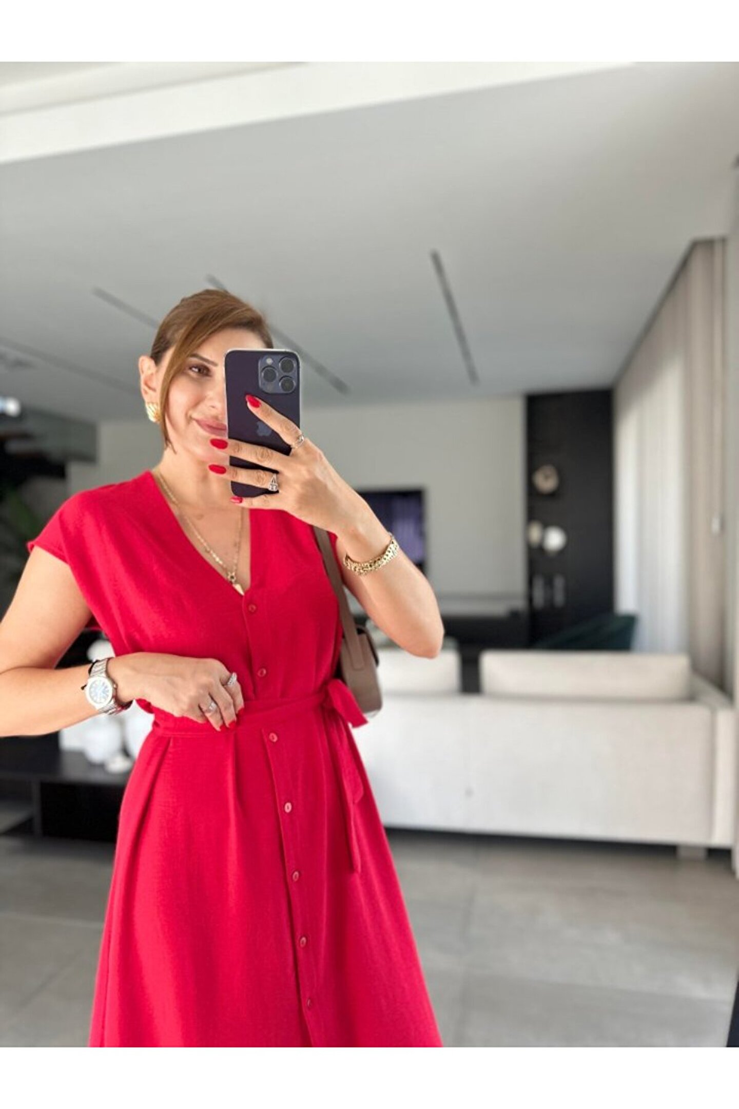 MUANA MOLINA EQURİ Kadınn V Yaka Düğme Detay Kuşak Dahil Elbise