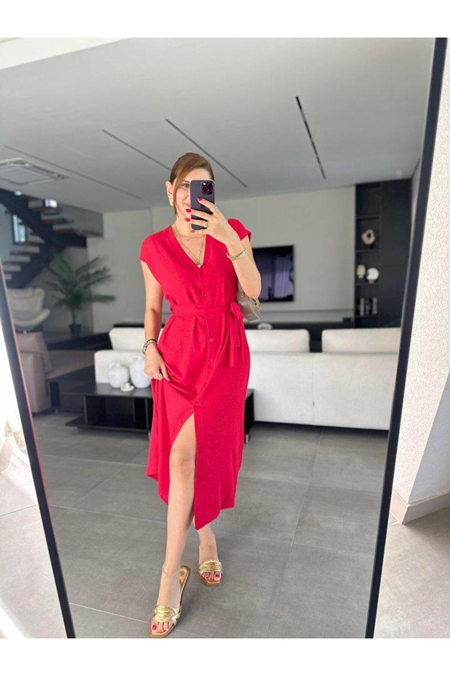 MUANA MOLINA Kadınn V Yaka Düğme Detay Kuşak Dahil Elbise