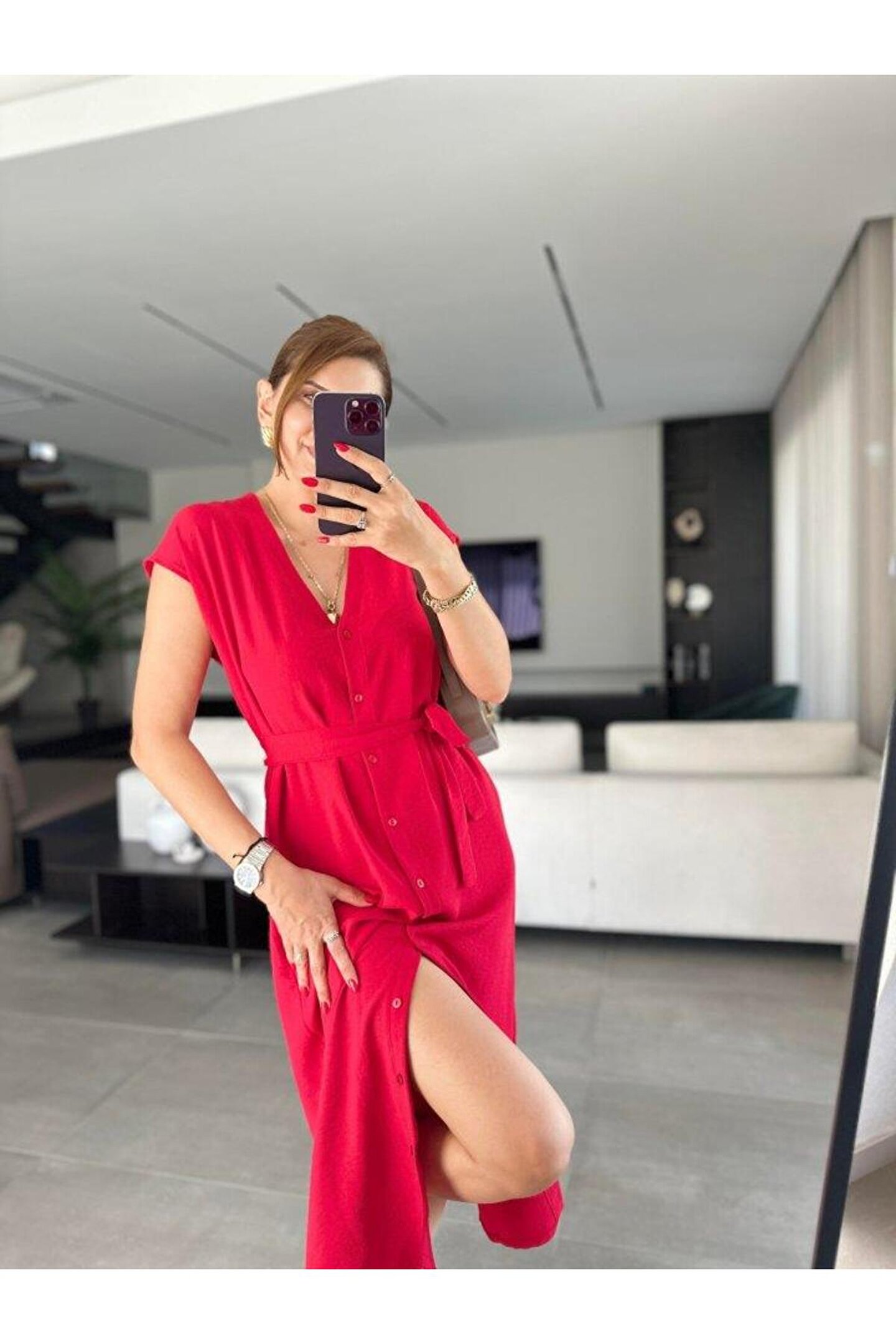 Kadınn V Yaka Düğme Detay Kuşak Dahil Elbise